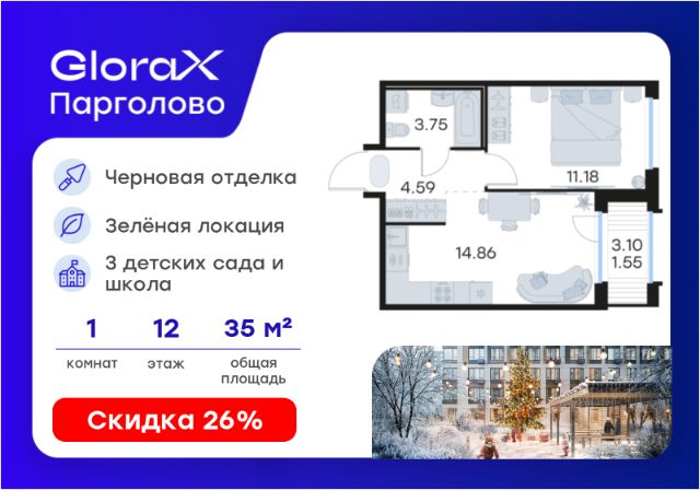 Продается 1-комн. квартира на 12-м этаже в проекте комфорт-класса GloraX Парголово. Общая площадь лота составляет 37,53 кв. м, из которых 14,28 кв. м отведено под жилую и 11,06 кв. м под кухонную зону. Номер квартиры - 116. Преимущества: - Квартира комфорт-класса - Зеленый район, Шуваловский парк в 20 мин. пешком - 10 мин. до КАД, 15 мин. до ЗСД - 5 эт. паркинг на 451 м/м - Закрытые дворы с видеонаблюдением - Детские площадки с геопласткой и бизиборадми - Сады и школы в шаговой доступности - Спортивные площадки и велодорожки - Собственный комьюнити-центр - Келлеры для хранения - Коммерческие помещения на 1 этажах GloraX Парголово — масштабный проект комфорт-класса в Выборгском районе Санкт-Петербурга. Место, продуманное до мелочей, где все, что необходимо — рядом. Архитектурно-пространственное решение отличается лаконичностью и строгостью и придает проекту свой характер. Внутренние дворы закрыты от внешнего мира, создавая приватную территорию для жителей. Живите на природе, но с комфортом мегаполиса. Десять минут на велосипеде или полчаса пешком — и вы окажетесь в одном из культовых мест отдыха петербуржцев: Шуваловском парке, Орловском заказнике с их чистыми карьерами или на Суздальских озерах. До ж/д станции "Парголово" 7 минут на автомобиле, до метро Проспект Просвещения 25 минут, КАД 10 минут, ЗСД 15 минут. В шаговой доступности остановка общественного транспорта. В шаговой доступности — собственные школы и детские сады. Здесь все создано для максимального комфорта каждого жителя. Приватное пространство внутреннего двора с беседками с розетками для работы и отдыха, зеленый двор с уютным многоуровневым освещением, детскими эко-площадками и спортивными workout создает неповторимую атмосферу, заряжающую энергией на новые свершения. Квартиры сдаются без отделки. Цена указана при 100% оплате или стандартной ипотеке. Узнайте подробности в Отделе продаж.