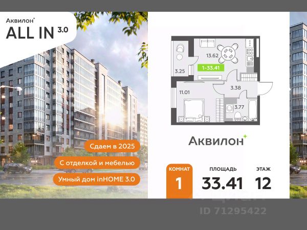 Купи квартиру в "ЖК All in 3.0" Отделка В квартире выполнена предчистовая отделка WhiteBox +Возможен дозаказ отделки в любом из 3 цветов: SAND, TERRA, GRAPHITE Отделка входит в стоимость квартиры в ДДУ ЖК Аквилон All in 3.0 в Пушкинском районе Петербурга. Это 12-этажный дом на Школьной улице на 812 квартир с отапливаемым подземным паркингом. -Малошумные лифты -Сквозные парадные -Светопрозрачные входные группы -Увеличенная высота первого этажа -Безбарьерная среда -Подземный паркинг Как и все другие проекты, ЖК Аквилон All in 3.0 мы реализуем на базе концепции Э4. Она подразумевает внедрение технологических разработок по 4 направлениям: энергоэффективности, эргономики, экологичности, экономии средств и времени жителей. Стандарты Группы Аквилон для вашей комфортной жизни Thermo-S экономия на коммунальных платежах за счет дополнительно утепленных стен, кровли и цоколя. Энергоэффективные окна с селективным покрытием и аргоновым заполнением Soundstop - дополнительная шумоизоляция внутренних перегородок и межэтажных перекрытий, шумозащитные окна, малошумные лифты Light-in - в квартирах устанавливаются широкоформатные окна, увеличены на 30%. Высота подоконников на уровне 60 см от пола. Vent-in - в каждой комнате есть клапаны индивидуальной вентиляции, которые обеспечивают приток свежего воздуха с улицы. inHOME 3.0 умный дом в каждой квартире Интеллектуальная цифровая система, которая позволит дистанционно решать бытовые вопросы, управлять квартирой и экономить на оплате коммунальных услуг. В состав inHOME входят: IP-домофон, Face key, "умные" счетчики, датчики протечки, дистанционное отключение розеток, и т.д. Жилой комплекс расположится в уже развитом районе с хорошей транспортной и социальной инфраструктурой: рядом — выезд на КАД, 15 минут до метро "Купчино" и аэропорта Пулково. #zSaeOf