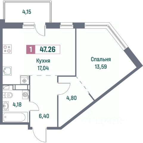 Кухня 9,5 кв.м., спальня 19 кв.м., санузл 4 кв.м, лоджия 2,5 кв.м.
