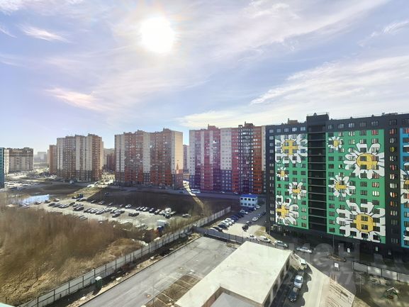 Квартира расположена на 14-ом этаже. Окна и балкон выходят во двор, на детский сад и спортивные площадки.