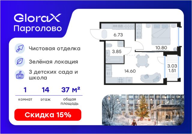 Продается 1-комн. квартира на 14-м этаже в проекте комфорт-класса GloraX Парголово. Общая площадь лота составляет 35,93 кв. м, из которых 11,18 кв. м отведено под жилую и 14,84 кв. м под кухонную зону. Номер квартиры - 267. Преимущества: - Квартира комфорт-класса - Зеленый район, Шуваловский парк в 20 мин. пешком - 10 мин. до КАД, 15 мин. до ЗСД - 5 эт. паркинг на 451 м/м - Закрытые дворы с видеонаблюдением - Детские площадки с геопласткой и бизиборадми - Сады и школы в шаговой доступности - Спортивные площадки и велодорожки - Собственный комьюнити-центр - Келлеры для хранения - Коммерческие помещения на 1 этажах GloraX Парголово — масштабный проект комфорт-класса в Выборгском районе Санкт-Петербурга. Место, продуманное до мелочей, где все, что необходимо — рядом. Архитектурно-пространственное решение отличается лаконичностью и строгостью и придает проекту свой характер. Внутренние дворы закрыты от внешнего мира, создавая приватную территорию для жителей. Живите на природе, но с комфортом мегаполиса. Десять минут на велосипеде или полчаса пешком — и вы окажетесь в одном из культовых мест отдыха петербуржцев: Шуваловском парке, Орловском заказнике с их чистыми карьерами или на Суздальских озерах. До ж/д станции "Парголово" 7 минут на автомобиле, до метро Проспект Просвещения 25 минут, КАД 10 минут, ЗСД 15 минут. В шаговой доступности остановка общественного транспорта. В шаговой доступности — собственные школы и детские сады. Здесь все создано для максимального комфорта каждого жителя. Приватное пространство внутреннего двора с беседками с розетками для работы и отдыха, зеленый двор с уютным многоуровневым освещением, детскими эко-площадками и спортивными workout создает неповторимую атмосферу, заряжающую энергией на новые свершения. Квартиры сдаются без отделки. Узнайте подробности в Отделе продаж.