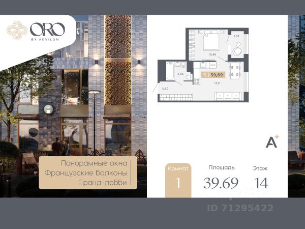 1-комн. квартира от застройщика с отделкой в ЖК "ORO by Akvilon" на 14 этаже. Общая площадь: 41.42 кв.м., жилая: 12.71 кв.м., площадь просторной кухни-столовой: 19.2 кв.м. Все окна выходят на одну сторону. В квартире одна лоджия, один совмещенный санузел. Высота потолков 2.85 м. Квартира находится в корпусе 1. Дом монолитный, одноподъездный, высотой 17 этажей. На этаже 12 квартир. В подъезде 1 пассажирский и 1 грузовой лифт. Окончание строительства - 4 квартал 2027 года. Оформление сделки по договору долевого участия. В шаговой доступности от дома расположена станция метро (расстояние по прямой) "Звёздная" (800 м), также недалеко от этого корпуса расположены станции метро: "Купчино", "Московская", "Ленинский Проспект", "Дунайская". ЖК "ORO by Akvilon" - старт продаж жилого комплекса бизнес-класса в Московском районе. -Панорамные окна в пол во всех квартирах -Алюминиевые оконные профили с многокамерными стеклопакетами -Французские балконы с золотой окантовкой -Высота этажа 3,15 метра -Увеличенные дверные проемы - 2,3 метров высотой -Выделенные места для кондиционеров на каждом этаже -Фреоновые трубки заведенные в квартиру от мест установки внешних блоков кондиционеров -Дизайнерская отделка гранд-лобби с биокамином и золотыми элементами -Импортные бесшумные лифты с дизайнерской отделкой и увеличенной высотой кабины Отделка квартир Премиальная отделка в двух цветовых решениях: Beigestone и Greystone. Дозаказ для любой квартиры Стандарты Группы Аквилон для вашей комфортной жизни Thermo-S экономия на коммунальных платежах за счет дополнительно утепленных стен, кровли и цоколя. Энергоэффективные окна с селективным покрытием и аргоновым заполнением Soundstop - дополнительная шумоизоляция внутренних перегородок и межэтажных перекрытий, шумозащитные окна, малошумные лифты Light-in - в квартирах комфортный микроклимат. Многокамерные стеклопакеты сохраняют тепло зимой и отсеивают излишки излучения солнечного света летом, сохраняя прохладу в помещении. Vent-in - в каждой комнате есть клапаны индивидуальной вентиляции, которые обеспечивают приток свежего воздуха с улицы. inHOME умный дом в каждой квартире Интеллектуальная цифровая система, которая позволит дистанционно решать бытовые вопросы, управлять квартирой и экономить на оплате коммунальных услуг. В состав inHOME входят: IP-домофон, Face key, "умные" счетчики, датчики протечки, дистанционное отключение розеток, и т.д. Подземный паркинг -Лифты в каждой секции со спуском в паркинг -Отделка лифтовых холлов паркинга в стиле Гранд лобби + дизайнерская навигация самого паркинга -Возможность установки электрозарядки в паркинге или на территории ЖК -GSM усилитель в паркинге Двор -Ландшафтный дизайн с геопластикой и цветочными аркадами -Сад цветущих сезонов -Разноуровневая подсветка -Детские площадки нового поколения -Живой зелёный забор -Закрытый двор без машин Локация -7 мин. до м. Звездная -10 мин. до м. Московская -15 мин. до аэропорта Пулково -30 мин. до Не