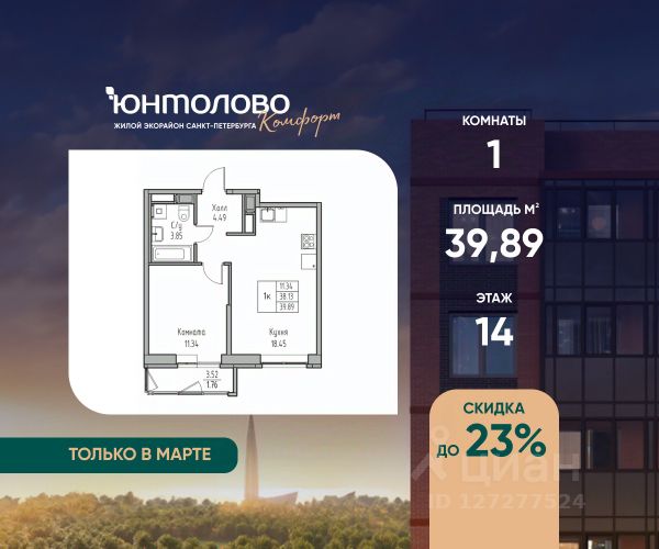 Продаeтся 1-к квартира 36.13 кв.м. экорайона "Юнтолово" (Приморский р-н) напрямую от застройщика "Главстрой Санкт-Петербург". Доступны льготная ипотека, рассрочка, трейд-ин и спецпредложения. Стоимость квартиры в объявлении указана со скидкой 10%. Cкидка прeдоcтавляется пpи 100% oплaтe или ипотeкe. Подробности уточняйте в отделе продаж. О проекте Жилой экорайон "Юнтолово" расположен в престижном Приморском районе, в живописной зелёной зоне недалеко от Юнтоловского заказника. На участке площадью 437 га планируется около 2,2 млн кв. м жилья с образовательной, медицинской, торговой, деловой инфраструктурой и общественными пространствами. Настоящее сердце "Юнтолово" — Центральный парк площадью 20 гектаров. Главная идея экорайона — близость к настоящей природе в черте города. Расположение и транспортная доступность Тишина и зелёное окружение района сочетаются с городской инфраструктурой и удобной логистикой. Остановки общественного транспорта до метро "Беговая", "Старая Деревня", "Комендантский проспект" и "Чёрная речка" в шаговой доступности. Близость КАД, ЗСД и Приморского шоссе обеспечивает быстрый выезд в центр, Курортный район и другие части города. Инфраструктура В парк-квартале "Юнтолово" создана вся необходимая социальная и коммерческая инфраструктура. Для детей открыты 4 современных детских сада и 2 школы. На первых этажах работают кафе и пекарни, магазины, аптеки, салоны красоты, МФЦ, почта России, развивающие центры для детей и другие сервисы. Для отдыха и спорта Особое внимание уделено качеству общественных пространств, формирующих среду для отдыха, общения и активного образа жизни. Для маленьких жителей организованы детские площадки с игровыми комплексами для всех возрастных групп. Для активного отдыха — уличные тренажёры, футбольные, волейбольные и баскетбольные поля, йога-зона, велодорожки, беговые маршруты и скейт-парк. На берегу реки Юнтоловки открыт гребной клуб "ПричалЮ" для любителей сапсёрфинга и гребли. Планировочные решения В "Юнтолово" предусмотрена широкая линейка планировок — от компактных студий 23 м² до семейных четырёхкомнатных квартир до 111 м² с мастер-спальнями, гостевым санузлом и системами хранения. Квартиры сдаются с чистовой отделкой "Комфорт" в светлом и темном решении. Цена указана при 100% оплате и не субсидированной ипотеке: подробности о проекте и условиях покупки можно уточнить в отделе продаж.