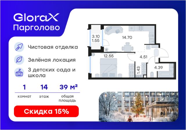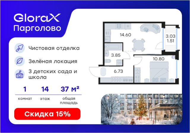 Продается 1-комн. квартира на 14-м этаже в проекте комфорт-класса GloraX Парголово. Общая площадь лота составляет 35,93 кв. м, из которых 11,18 кв. м отведено под жилую и 14,84 кв. м под кухонную зону. Номер квартиры - 267. Преимущества: - Квартира комфорт-класса - Зеленый район, Шуваловский парк в 20 мин. пешком - 10 мин. до КАД, 15 мин. до ЗСД - 5 эт. паркинг на 451 м/м - Закрытые дворы с видеонаблюдением - Детские площадки с геопласткой и бизиборадми - Сады и школы в шаговой доступности - Спортивные площадки и велодорожки - Собственный комьюнити-центр - Келлеры для хранения - Коммерческие помещения на 1 этажах GloraX Парголово — масштабный проект комфорт-класса в Выборгском районе Санкт-Петербурга. Место, продуманное до мелочей, где все, что необходимо — рядом. Архитектурно-пространственное решение отличается лаконичностью и строгостью и придает проекту свой характер. Внутренние дворы закрыты от внешнего мира, создавая приватную территорию для жителей. Живите на природе, но с комфортом мегаполиса. Десять минут на велосипеде или полчаса пешком — и вы окажетесь в одном из культовых мест отдыха петербуржцев: Шуваловском парке, Орловском заказнике с их чистыми карьерами или на Суздальских озерах. До ж/д станции "Парголово" 7 минут на автомобиле, до метро Проспект Просвещения 25 минут, КАД 10 минут, ЗСД 15 минут. В шаговой доступности остановка общественного транспорта. В шаговой доступности — собственные школы и детские сады. Здесь все создано для максимального комфорта каждого жителя. Приватное пространство внутреннего двора с беседками с розетками для работы и отдыха, зеленый двор с уютным многоуровневым освещением, детскими эко-площадками и спортивными workout создает неповторимую атмосферу, заряжающую энергией на новые свершения. Квартиры сдаются без отделки. Узнайте подробности в Отделе продаж.