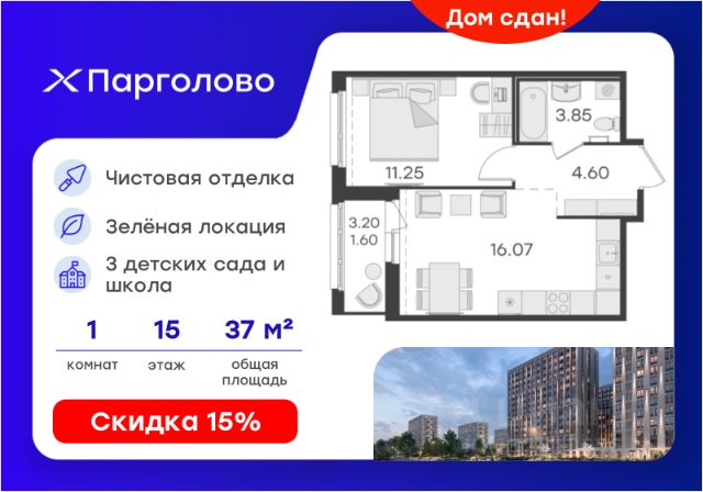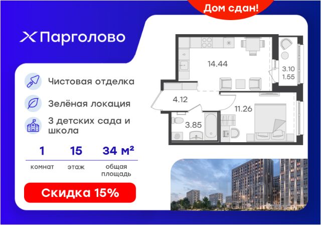Продается 1-комн. квартира на 15-м этаже в проекте комфорт-класса Парголово. Общая площадь лота составляет 32,46 кв. м, из которых 10,15 кв. м отведено под жилую и 13,45 кв. м под кухонную зону. Номер квартиры - 138. Преимущества: - Квартира комфорт-класса - Зеленый район, Шуваловский парк в 20 мин. пешком - 10 мин. до КАД, 15 мин. до ЗСД - 5 эт. паркинг на 451 м/м - Закрытые дворы с видеонаблюдением - Детские площадки с геопласткой и бизиборадми - Сады и школы в шаговой доступности - Спортивные площадки и велодорожки - Собственный комьюнити-центр - Келлеры для хранения - Коммерческие помещения на 1 этажах Парголово — масштабный проект комфорт-класса в Выборгском районе Санкт-Петербурга. Место, продуманное до мелочей, где все, что необходимо — рядом. Архитектурно-пространственное решение отличается лаконичностью и строгостью и придает проекту свой характер. Внутренние дворы закрыты от внешнего мира, создавая приватную территорию для жителей. Живите на природе, но с комфортом мегаполиса. Десять минут на велосипеде или полчаса пешком — и вы окажетесь в одном из культовых мест отдыха петербуржцев: Шуваловском парке, Орловском заказнике с их чистыми карьерами или на Суздальских озерах. До ж/д станции "Парголово" 7 минут на автомобиле, до метро Проспект Просвещения 25 минут, КАД 10 минут, ЗСД 15 минут. В шаговой доступности остановка общественного транспорта. В шаговой доступности — собственные школы и детские сады. Здесь все создано для максимального комфорта каждого жителя. Приватное пространство внутреннего двора с беседками с розетками для работы и отдыха, зеленый двор с уютным многоуровневым освещением, детскими эко-площадками и спортивными площадками создает неповторимую атмосферу, заряжающую энергией на новые свершения. Квартиры сдаются без отделки. Узнайте подробности в Отделе продаж.