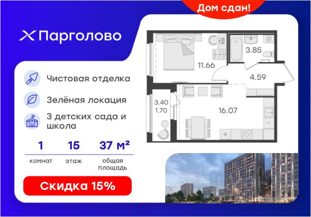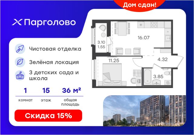 Продается 1-комн. квартира на 15-м этаже в проекте комфорт-класса Парголово. Общая площадь лота составляет 32,46 кв. м, из которых 10,15 кв. м отведено под жилую и 13,45 кв. м под кухонную зону. Номер квартиры - 138. Преимущества: - Квартира комфорт-класса - Зеленый район, Шуваловский парк в 20 мин. пешком - 10 мин. до КАД, 15 мин. до ЗСД - 5 эт. паркинг на 451 м/м - Закрытые дворы с видеонаблюдением - Детские площадки с геопласткой и бизиборадми - Сады и школы в шаговой доступности - Спортивные площадки и велодорожки - Собственный комьюнити-центр - Келлеры для хранения - Коммерческие помещения на 1 этажах Парголово — масштабный проект комфорт-класса в Выборгском районе Санкт-Петербурга. Место, продуманное до мелочей, где все, что необходимо — рядом. Архитектурно-пространственное решение отличается лаконичностью и строгостью и придает проекту свой характер. Внутренние дворы закрыты от внешнего мира, создавая приватную территорию для жителей. Живите на природе, но с комфортом мегаполиса. Десять минут на велосипеде или полчаса пешком — и вы окажетесь в одном из культовых мест отдыха петербуржцев: Шуваловском парке, Орловском заказнике с их чистыми карьерами или на Суздальских озерах. До ж/д станции "Парголово" 7 минут на автомобиле, до метро Проспект Просвещения 25 минут, КАД 10 минут, ЗСД 15 минут. В шаговой доступности остановка общественного транспорта. В шаговой доступности — собственные школы и детские сады. Здесь все создано для максимального комфорта каждого жителя. Приватное пространство внутреннего двора с беседками с розетками для работы и отдыха, зеленый двор с уютным многоуровневым освещением, детскими эко-площадками и спортивными площадками создает неповторимую атмосферу, заряжающую энергией на новые свершения. Квартиры сдаются без отделки. Узнайте подробности в Отделе продаж.
