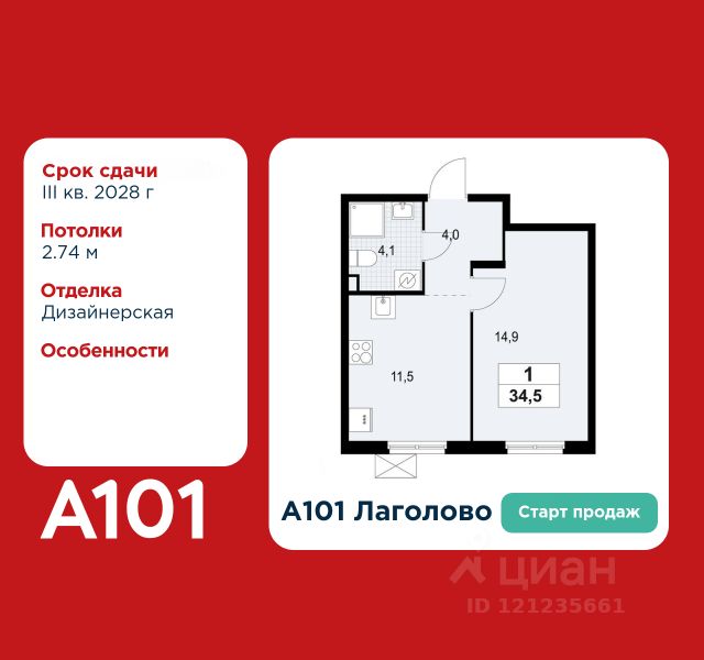 Старт продаж! 1-комнатная квартира площадью 35.80 в ЖК "А101 Лаголово" на 2 этаже. Квартира без отделки. Вид из окна на улицу. В квартире 1 санузел. Высота потолков 2.74 м. Предложения от застройщика на ноябрь 2025: - Гибкая рассрочка 20 000 руб/мес. и первым взносом 10%. ОТДЕЛКА Квартира передается без отделки. Благодаря тому, что в данном типе отделки стены не возводятся, вы сможете создать удобную планировку и самостоятельно организовать зонирование комнат. ОСОБЕННОСТИ ПЛАНИРОВКИ Из окон квартиры открывается живописный вид на зелёный пешеходный бульвар, который строится одновременно с домами. КВАРТИРА С МЕБЕЛЬЮ И ТЕХНИКОЙ В стоимость квартиры включен сертификат на 100 000 рублей от партнеров Hoff и M.Видео. Вы можете увеличить сумму сертификата и добавить его в ипотеку. А также у вас будет возможность увидеть все товары вживую перед установкой и выбрать лучшие варианты для обустройства вашей квартиры. ПАРАДНАЯ. В каждой парадной предусмотрены места для хранения велосипедов и колясок, гостевой санузел и удобная зона ожидания для гостей. ДВОРЫ И ОКРУЖЕНИЕ. Просторные дворы безопасны для детей, так как свободны от машин, закрыты от посторонних и постоянно находятся под видеонаблюдением. Во дворах создается разнообразная среда для детей всех возрастов: детские площадки с батутами, тактильными дорожками и игровыми комплексами. Для активного отдыха - воркаут-площадки, столы для пинг-понга и газоны для занятий йогой. Во дворах есть и тихие уголки - зеленые гостиные с уличной мебелью, где можно поработать на свежем воздухе или отдохнуть в тишине. Из внутренних дворов комплекса можно выйти на пешеходный бульвар длиной около 900 метров. Здесь будет организовано полноценное общественное пространство с амфитеатром, уличным кафе, ручьем, фонтаном и множеством мест для отдыха и игр. Большую часть бульвара займут благоустроенные зеленые зоны и теневые сады из десятков видов деревьев и кустарников, многолетних цветов и трав, которые будут радовать глаз круглый год. "А101 Лаголово" - современный город у подножия знаменитых Дудерговских высот, в объятиях чистейших озер и зеленых живописных массивов, наполненный всем необходимым для счастливой жизни. ИНФРАСТРУКТУРА. Мы занимаемся комплексным освоением территории. Наш приоритет - доступность всех сервисов для счастливой жизни. 1. Лаголово-город 15-ти минутной доступности. Вся необходимая инфраструктура: магазины, салоны красоты, образовательные учреждения, медицинские центры находятся в 15-ти минутах пешей прогулки от любой точки жилого комплекса. Это позволяет не тратить время на долгие перемещения. 2. Представьте идеальный город, где ребенок может спокойно играть, а пожилой человек наслаждаться заслуженным отдыхом. Жилая среда нашего комплекса может комфортно использоваться как 8-летним ребенком, так и 80-летним пожилым человеком. Дома, улицы, общественные пространства, тротуары спроектированы с заботой о людях разных возрастов. 3. Мы активно развиваем авторскую образовательную экосистему "Лёрнити
