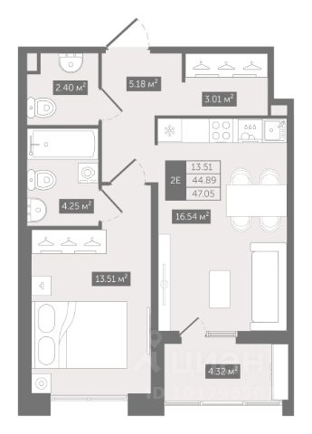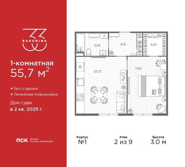 Однокомнатная квартира от застройщика в ЖК "BAKUNINA 33" на 2 этаже. Квартира без отделки, полностью готова к ремонту. Общая площадь: 54.8 кв.м., жилая: 19.95 кв.м., площадь просторной кухни-столовой: 30.09 кв.м. Все окна выходят на одну сторону. В квартире один совмещенный санузел. Высота потолков 3.0 м. Дом монолитный, трехподъездный, высотой 9 этажей. Квартира находится в 1-й секции в корпусе 1. На этаже 7 квартир. В подъезде 1 пассажирский и 1 грузовой лифт. Начало строительства - 2 квартал 2023 года. В настоящее время строительство завершено, дом сдан во 2 квартале 2025 года. Оформление сделки по договору купли-продажи. В шаговой доступности от дома имеются станции метро (расстояние по прямой): "Площадь Александра Невского" (700 м), "Площадь Александра Невского 1" (700 м), "Площадь Александра Невского 2" (800 м), "Площадь Восстания" (1.4 км), "Новочеркасская" (1.5 км), также недалеко от этого корпуса расположены станции метро: "Владимирская", "Чернышевская", "Ладожская". Клубный дом BAKUNINA 33 - новый стандарт престижной жизни в Центральном районе. В 10 минутах от Невского проспекта и в двух минутах от Синопской набережной и Невы, в благоустроенной и знакомой среде. Локация клубного дома Bakunina 33 - идеальное место для погружения в культурную и светскую жизнь Санкт-Петербурга. В 10-15 минутах на машине почти все знаковые достопримечательности города: Эрмитаж, Русский музей, Александринский и Мариинский театры, БДТ, Таврический парк Казанский собор, Спас на крови и другие величественные дворцы, соборы, музеи, ради которых в город ежегодно съезжаются тысячи гостей. Каждая линия и каждый элемент дизайна дома является частью целостной концепции. Облик здания гармоничный, классически сдержанный с выверенными пропорциями и элегантными формами. Цветовые и архитектурные решения и эркеры придают облику дома легкость, доступную лишь респектабельной классике. Фасады привлекают внимание плавными ритмичными переходами. Вертикальная разбивка колоннами визуально устремляет здание ввысь. Плоскость фасадов декорирована разными элементами из гранита. Ограждение балконов, эркеры и колонны дополнены лаконичным геометрическим орнаментом в акцентном теплом сером цвете. Первые два этажа дома облицованы натуральным гранитом тёмного оттенка. Основной объём здания - выполнен штукатурным фасадом с окраской светлыми тонами из цветовой палитры " Традиционные цвета Санкт-Петербурга". Верхний этаж выполнен в стиле мансарды с высотой потолков в квартирах 3,5 метра. Этим достигается цель гармоничного и сомасштабного существования в одном фронте с существующими зданиями. За венчающим карнизом располагаются балконы девятого этажа. Ограждения балконов дополнены геометрическими узорами. Закрытый внутренний двор со сквером и детской площадкой. Острова зелени с водной чашей в центре создают ощущение гармонии и умиротворения. Современная уличная мебель и освещение формируют домашнюю атмосферу уюта и представляют двор как дополнительное частное пространст