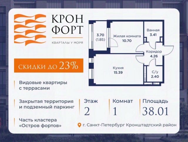 Стоимость квартиры указана со скидкой 20%. Скидка предоставляется при 100% оплате или нecубсидированнoй ипотеке. Возможно повышение скидки до 23%, подробности уточняйте у менеджера по телефону. Прeдлaгaeтcя кваpтиpa площaдью 38.29 кв.м в жилoм комплексe "Кpoнфорт. Центрaльный" в Caнкт-Пeтербуpгe (Kpoнштадт). Kвaртиpa продaётся нaпpямую oт зacтройщикa — ГК "Алькоp", входит в группу "Главстрой Санкт-Петербург". Возможна покупка с использованием льготных и специальных ипотечных программ с государственной поддержкой. "Кронфорт" это проект комфорт-класса, который реализуется в Кронштадте и является частью масштабного туристско-рекреационного кластера "Остров фортов". Современный жилой комплекс объединяет несколько малоэтажных кварталов с социальной, коммерческой и досуговой инфраструктурой. Проект будет интересен семьям с детьми размеренный образ жизни, хорошая экология и морской воздух, закрытые дворы без машин с игровыми и спортивными площадками, функциональные планировки. Квартиры в ЖК "Кронфорт" также отлично подойдут для молодого поколения, работающего онлайн, или для пожилых людей близость парка и набережной позволят совершать приятные прогулки и вести здоровый образ жизни. Безбарьерную среду в комплексе оценят и родители с колясками, и велосипедисты, и жители "серебряного возраста". Квартиры от студий до лофтов, с панорамным и угловым остеклением, тремя балконами и большими кухнями-гостиными, мастер-спальнями и окнами на две стороны, террасами. Метраж варьируется от 24 до 106 кв. м. Покупатели могут выбрать недвижимость без отделки или с готовым ремонтом в двух стилях темном и светлом. Транспортная доступность: Жилой квартал "Кронфорт. Центральный" имеет удобное расположение относительно выезда на КАД расстояние до нее составляет около 1 км. - 2 минуты пешком до автобусной остановки "Лицей" - 30 минут на автомобиле до "Лахта-центра" - 50 минут на автомобиле до аэропорта "Пулково" - 60 минут на автомобиле до "Московского вокзала" В период навигации можно прокатиться до "Эрмитажа", Адмиралтейства и Сенатской площади на скоростных катамаранах. Инфраструктура: Напротив ЖК "Кронфорт. Центральный" открыт инженерный лицей. Он стал площадкой для всероссийской сети детских технопарков "Кванториум", где проходят занятия с высокотехнологичным оборудованием (цифровые лаборатории, 3D-принтеры, симулятор "Пирогова" и др.) для изучения передовых технологий. Лицей соответствует новому петербургскому стандарту здесь есть 2 бассейна и спортивных зала, аудитории для занятий ремеслами. Также в "Кронфорт. Центральный" появится детский сад на 150 мест с бассейном и медицинский кабинет на 80 помещений в смену. Преимущества ЖК "Кронфорт": - Малоэтажный жилой комплекс с авторской архитектурой, разработанной с участием компании Chapman Taylor и петербургского бюро "Проектная культура", - Подземный паркинг и кладовые для удобства жильцов, - Более 100 видов планировочных решений, - Высота потолков в квартир