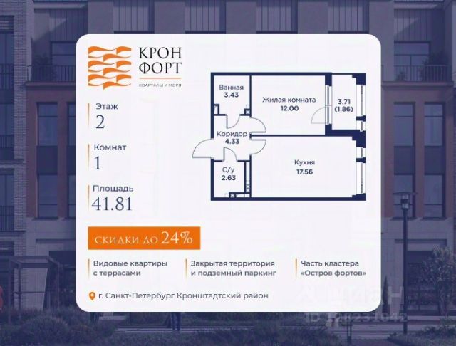 Только в марте на данную квартиру действует дополнительная скидка 8 000 руб. с кв.м. Стоимость квартиры в объявлении указана со скидкой 21%. Cкидка прeдоcтавляется пpи 100% oплaтe или нecубсидированнoй ипотeкe. Возможно повышение скидки до 24%. Подробности уточняйте в отделе продаж. Предлaгaeтся квартира плoщaдью 39.31 кв.м в жилом кoмплексе "Kронфoрт. Центpальный" в Санкт-Петeрбурге (Кронштадт). Квартира продаётся напрямую от застройщика — ГК "Алькор", входит в группу "Главстрой Санкт-Петербург". Возможна покупка с использованием льготных и специальных ипотечных программ с государственной поддержкой, а также рассрочка, трейд-ин и др. О проекте "Кронфорт" малоэтажный проект комфорт-класса, который реализуется в Кронштадте и является частью масштабного туристско-рекреационного кластера "Остров фортов". Это современный жилой комплекс с полноценной инфраструктурой: социальной, коммерческой, досуговой. Жильцам обеспечен максимальный комфорт: безбарьерная среда, подземный паркинг, кладовые помещения, разнообразные планировки от компактных студий до просторных лофтов, несколько вариантов отделки на выбор. Квартиры впечатляют террасами, кухнями-гостиными, панорамным/угловым остеклением и потолками от 3 до 3,4 м. Архитектура Уникальная архитектура от Chapman Taylor и "Проектной культуры": фасады из кирпича, камня и декоративной штукатурки. Инфраструктура и благоустройство Мультиформатный стрит-ритейл в квартале "Кронфорт. Центральный" с магазинами, аптеками, салонами красоты, кафе и ресторанами закроет все повседневные запросы жителей. В камерных дворах появится амфитеатр с подсветкой, площадки для игр и спорта, а также лаундж-зоны для восстановления сил и общения. Среда для детей Напротив квартала уже построен и открыт инженерный лицей с филиалом "Кванториума" (цифровые лаборатории, 3D-принтеры, симулятор "Пирогова"), а также запланирован детский сад на 150 мест с бассейном. Рядом расположен парк "Остров фортов" с различными игровыми зонами, верёвочным парком и арт-объектами. Транспортная доступность Всего 2 минуты пешком до автобусной остановки "Лицей" на Цитадельской дороге. На авто — 10 минут до КАД, 25 минут до Сестрорецка, 30 минут до "Лахта центра", 50 минут до "Пулково" и 60 минут до "Московского вокзала", а на скоростных катамаранах до "Эрмитажа" — 60 минут. Продается 1-комнатная квартира на 2 этаже в Кронштадте.