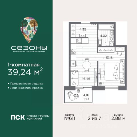Просторная 1-комн. квартира с отделкой в ЖК "Сезоны" на 2 этаже. Общая площадь: 34.82 кв.м., жилая: 12.76 кв.м., площадь просторной кухни-столовой: 15.08 кв.м. Все окна выходят на одну сторону. В квартире один совмещенный санузел. Высота потолков 2.88 м. Дом монолитный, многоподъездный, высотой 7 этажей. Квартира находится в 1-й секции в корпусе 631. На этаже 5 квартир. В подъезде 1 грузовой лифт. Начало строительства - 4 квартал 2025 года. Окончание строительства - 2 квартал 2028 года. Оформление сделки по договору долевого участия. Видовой жилой комплекс "Сезоны" от ГК ПСК возводится в одном из самых востребованных и престижных районов Санкт-Петербурга - Приморском, рядом с Суздальским и Выборгским шоссе. Такое расположение обеспечивает удобный выезд в разные части города, сочетая городской комфорт с близостью к природе. Всего в 50 метрах находится природный заказник "Новоорловский" и речка Каменка, а в пешей доступности - Суздальские озёра. Приморский район отличается развитой социальной и транспортной инфраструктурой. Здесь расположены крупные торговые и деловые центры, современные спортивные объекты, медицинские учреждения, магазины, кафе и рестораны. Комплекс включает четыре корпуса, ввод которых в эксплуатацию запланирован на 2028 год. Проект и прилегающий микрорайон разработаны в соответствии с концепцией "15-минутного города", при которой вся необходимая инфраструктура находится в шаговой доступности. В ближайшем окружении - две школы, пять детских садов, магазины, кафе, салоны красоты, банковские отделения и пункты выдачи заказов. Также предусмотрены два четырёхъярусных паркинга с лифтами на 288 машиномест. О застройщике ГК ПСК - один из крупнейших девелоперов Санкт-Петербурга с более чем 18-летней историей. Компания реализует проекты во всех сегментах недвижимости - от премиальных жилых комплексов до масштабных кварталов комфорт-класса и апарт-отелей. По данным портала ЕРЗ.РФ, ПСК входит в ТОП-3 крупнейших застройщиков Санкт-Петербурга по объёму текущего строительства. Портфель компании превышает 3 млн кв. м жилой и коммерческой недвижимости. Все объекты сдаются строго в срок и отличаются высоким уровнем архитектурных и инженерных решений. #ZTOibi
