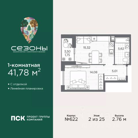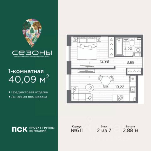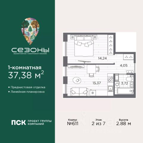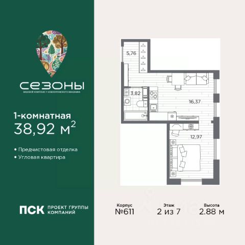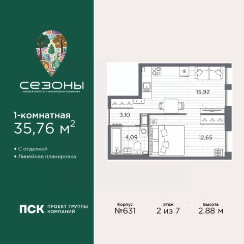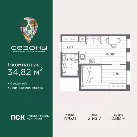 Однокомнатная квартира от застройщика с отделкой в ЖК "Сезоны" на 2 этаже. Общая площадь: 34.82 кв.м., жилая: 12.76 кв.м., площадь просторной кухни-столовой: 15.08 кв.м. Все окна выходят на одну сторону. В квартире один совмещенный санузел. Высота потолков 2.88 м. Дом монолитный, многоподъездный, высотой 7 этажей. Квартира находится в 1-й секции в корпусе 631. На этаже 5 квартир. В подъезде 1 грузовой лифт. Начало строительства - 4 квартал 2025 года. Окончание строительства - 2 квартал 2028 года. Оформление сделки по договору долевого участия. Видовой жилой комплекс "Сезоны" от ГК ПСК возводится в одном из самых востребованных и престижных районов Санкт-Петербурга - Приморском, рядом с Суздальским и Выборгским шоссе. Такое расположение обеспечивает удобный выезд в разные части города, сочетая городской комфорт с близостью к природе. Всего в 50 метрах находится природный заказник "Новоорловский" и речка Каменка, а в пешей доступности - Суздальские озёра. Приморский район отличается развитой социальной и транспортной инфраструктурой. Здесь расположены крупные торговые и деловые центры, современные спортивные объекты, медицинские учреждения, магазины, кафе и рестораны. Комплекс включает четыре корпуса, ввод которых в эксплуатацию запланирован на 2028 год. Проект и прилегающий микрорайон разработаны в соответствии с концепцией "15-минутного города", при которой вся необходимая инфраструктура находится в шаговой доступности. В ближайшем окружении - две школы, пять детских садов, магазины, кафе, салоны красоты, банковские отделения и пункты выдачи заказов. Также предусмотрены два четырёхъярусных паркинга с лифтами на 288 машиномест. О застройщике ГК ПСК - один из крупнейших девелоперов Санкт-Петербурга с более чем 18-летней историей. Компания реализует проекты во всех сегментах недвижимости - от премиальных жилых комплексов до масштабных кварталов комфорт-класса и апарт-отелей. По данным портала ЕРЗ.РФ, ПСК входит в ТОП-3 крупнейших застройщиков Санкт-Петербурга по объёму текущего строительства. Портфель компании превышает 3 млн кв. м жилой и коммерческой недвижимости. Все объекты сдаются строго в срок и отличаются высоким уровнем архитектурных и инженерных решений. #ZToibl