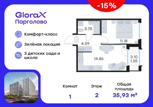 Продается 1-комн. квартира на 2-м этаже в проекте комфорт-класса GloraX Парголово. Общая площадь лота составляет 37,65 кв. м, из которых 10,83 кв. м отведено под жилую и 14,93 кв. м под кухонную зону. Номер квартиры - 154. Преимущества: - Квартира комфорт-класса с полной чистовой отделкой - Зеленый район, Шуваловский парк в 20 мин. пешком - 10 мин. до КАД, 15 мин. до ЗСД - 5 эт. паркинг на 451 м/м - Закрытые дворы с видеонаблюдением - Детские площадки с геопласткой и бизиборадми - Сады и школы в шаговой доступности - Спортивные площадки и велодорожки - Собственный комьюнити-центр - Келлеры для хранения - Коммерческие помещения на 1 этажах GloraX Парголово — масштабный проект комфорт-класса в Выборгском районе Санкт-Петербурга. Место, продуманное до мелочей, где все, что необходимо — рядом. Архитектурно-пространственное решение отличается лаконичностью и строгостью и придает проекту свой характер. Внутренние дворы закрыты от внешнего мира, создавая приватную территорию для жителей. Живите на природе, но с комфортом мегаполиса. Десять минут на велосипеде или полчаса пешком — и вы окажетесь в одном из культовых мест отдыха петербуржцев: Шуваловском парке, Орловском заказнике с их чистыми карьерами или на Суздальских озерах. До ж/д станции "Парголово" 7 минут на автомобиле, до метро Проспект Просвещения 25 минут, КАД 10 минут, ЗСД 15 минут. В шаговой доступности остановка общественного транспорта. В шаговой доступности — собственные школы и детские сады. Здесь все создано для максимального комфорта каждого жителя. Приватное пространство внутреннего двора с беседками с розетками для работы и отдыха, зеленый двор с уютным многоуровневым освещением, детскими эко-площадками и спортивными workout создает неповторимую атмосферу, заряжающую энергией на новые свершения. Квартиры сдаются с предчистовой отделкой White box, с возможностью дозаказа отделки в двух цветовых вариантах. Цена указана при 100% оплате или стандартной ипотеке. Узнайте подробности в Отделе продаж.