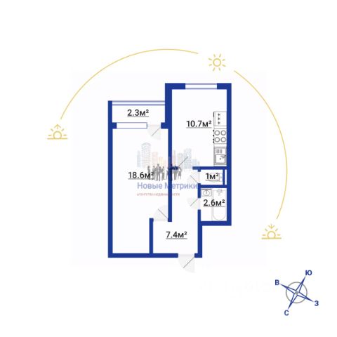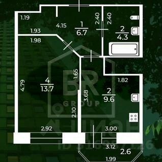 Комната 13,7кв.м., кухня 9,3кв.м, санузел 4,39кв.м., гардеробная 2,3кв.м., балконы 2,37 и 2,41кв.м.