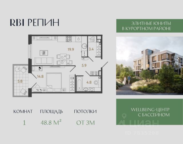 "Репин" — элитный лаунж-комплекс от RBI в Курортном районе Петербурга в посёлке Репино по адресу Приморское шоссе, 441. Шоссе считается петербургским аналогом трассы Канны Ницца Монако. Вместо пиний — сосновый лес, который сменяется открытыми морскими видами хотя и не Средиземного моря, но такого же просторного Финского залива. Проезжая по Приморскому шоссе, вы уже отдыхаете. После Репинских Пенатов дорога круто поворачивает к югу и совершает плавную дугу к западу — именно здесь в 400 метрах от залива располагаются роскошные виллы вэлнес-комплекса "Репин". Формат проживания камерный — без суеты и лишнего шума. В четырёх виллах всего 84 сити-хауса. Есть номера с палисадниками и отдельным входом, лоты с террасами и возможностью установки дровяного камина, двухэтажные юниты с двусветной кухней-гостиной, высота потолков в которой достигает 6,3 или 6,6 метров. На типовых этажах потолки 3 метра, на последнем этаже — 3,3 метра. Площадь юнитов от 45,8 до 150,7 м² — можно приобрести инвестиционный лот под сдачу в аренду или купить номер для собственного роскошного проживания. Конструкция стен продумана таким образом, чтобы вы могли реализовать перепланировку пространства вплоть до объединения соседних юнитов с сохранением высокой звукоизоляции между номерами. На территории комплекса находятся ещё два инфраструктурных корпуса — они располагаются вдоль шоссе и создают визуальный и акустический барьер для вилл. В первом корпусе находятся центральная входная группа с ресепшн и зоной ожидания гостей, ресторан с отдельным входом и wellbeing-центр, где оборудуют спортзал, бассейн, хамам и сауну. Всё, чтобы вы могли переключиться от рутины и обрести себя заново! Во втором корпусе — трёхуровневый паркинг на 60 машиномест. Ещё 10 м/м на уличной автостоянке. Все виллы — малоэтажные и размещены в шахматном порядке, чтобы вы могли наблюдать умиротворяющий пейзаж прямо из окон или с террасы своего номера. Лаконичная скандинавская архитектура вторит окружению и способствует расслаблению, а декоративная ландшафтная подсветка преображает комплекс в сумерки. Приватная охраняемая территория утопает в зелени: равнины перемежаются с живописными холмами, создавая аллюзию на пейзажный парк. Среди всей этой красоты благоустроены разнообразные лаунжи: две открытые площадки для встреч у костра и обогреваемая фуршетная зона, подиум с деревянными шезлонгами и декоративный водоём с кинетической скульптурой от Владислава Муханова и Ивана Зубарева. Дети могут играть на экологичной детской площадке во дворе, а спортсмены — заниматься на профессиональных уличных тренажёрах FOREMAN. Refresh-коплекс "Репин". Ваш источник безмятежности в лоне природы побережья Финского залива!