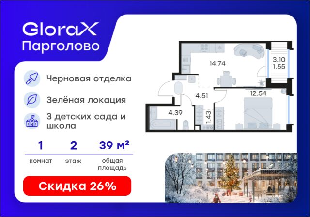 Продается 1-комн. квартира на 2-м этаже в проекте комфорт-класса GloraX Парголово. Общая площадь лота составляет 35,93 кв. м, из которых 11,18 кв. м отведено под жилую и 14,86 кв. м под кухонную зону. Номер квартиры - 1. Преимущества: - Квартира комфорт-класса - Зеленый район, Шуваловский парк в 20 мин. пешком - 10 мин. до КАД, 15 мин. до ЗСД - 5 эт. паркинг на 451 м/м - Закрытые дворы с видеонаблюдением - Детские площадки с геопласткой и бизиборадми - Сады и школы в шаговой доступности - Спортивные площадки и велодорожки - Собственный комьюнити-центр - Келлеры для хранения - Коммерческие помещения на 1 этажах GloraX Парголово — масштабный проект комфорт-класса в Выборгском районе Санкт-Петербурга. Место, продуманное до мелочей, где все, что необходимо — рядом. Архитектурно-пространственное решение отличается лаконичностью и строгостью и придает проекту свой характер. Внутренние дворы закрыты от внешнего мира, создавая приватную территорию для жителей. Живите на природе, но с комфортом мегаполиса. Десять минут на велосипеде или полчаса пешком — и вы окажетесь в одном из культовых мест отдыха петербуржцев: Шуваловском парке, Орловском заказнике с их чистыми карьерами или на Суздальских озерах. До ж/д станции "Парголово" 7 минут на автомобиле, до метро Проспект Просвещения 25 минут, КАД 10 минут, ЗСД 15 минут. В шаговой доступности остановка общественного транспорта. В шаговой доступности — собственные школы и детские сады. Здесь все создано для максимального комфорта каждого жителя. Приватное пространство внутреннего двора с беседками с розетками для работы и отдыха, зеленый двор с уютным многоуровневым освещением, детскими эко-площадками и спортивными workout создает неповторимую атмосферу, заряжающую энергией на новые свершения. Квартиры сдаются без отделки. Цена указана при 100% оплате или стандартной ипотеке. Узнайте подробности в Отделе продаж.