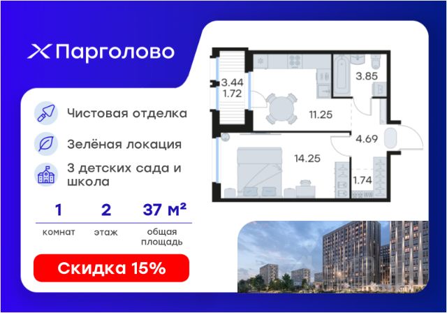 Продается 1-комн. квартира на 2-м этаже в проекте комфорт-класса Парголово. Общая площадь лота составляет 36,93 кв. м, из которых 14,28 кв. м отведено под жилую и 10,66 кв. м под кухонную зону. Номер квартиры - 151. Преимущества: - Квартира комфорт-класса - Зеленый район, Шуваловский парк в 20 мин. пешком - 10 мин. до КАД, 15 мин. до ЗСД - 5 эт. паркинг на 451 м/м - Закрытые дворы с видеонаблюдением - Детские площадки с геопласткой и бизиборадми - Сады и школы в шаговой доступности - Спортивные площадки и велодорожки - Собственный комьюнити-центр - Келлеры для хранения - Коммерческие помещения на 1 этажах Парголово — масштабный проект комфорт-класса в Выборгском районе Санкт-Петербурга девелопера GloraX. Место, продуманное до мелочей, где все, что необходимо — рядом. Архитектурно-пространственное решение отличается лаконичностью и строгостью и придает проекту свой характер. Внутренние дворы закрыты от внешнего мира, создавая приватную территорию для жителей. Живите на природе, но с комфортом мегаполиса. Десять минут на велосипеде или полчаса пешком — и вы окажетесь в одном из культовых мест отдыха петербуржцев: Шуваловском парке, Орловском заказнике с их чистыми карьерами или на Суздальских озерах. До ж/д станции "Парголово" 7 минут на автомобиле, до метро Проспект Просвещения 25 минут, КАД 10 минут, ЗСД 15 минут. В шаговой доступности остановка общественного транспорта. В шаговой доступности — собственные школы и детские сады. Здесь все создано для максимального комфорта каждого жителя. Приватное пространство внутреннего двора с беседками с розетками для работы и отдыха, зеленый двор с уютным многоуровневым освещением, детскими эко-площадками и спортивными площадками создает неповторимую атмосферу, заряжающую энергией на новые свершения. Квартиры сдаются без отделки. Узнайте подробности в Отделе продаж.