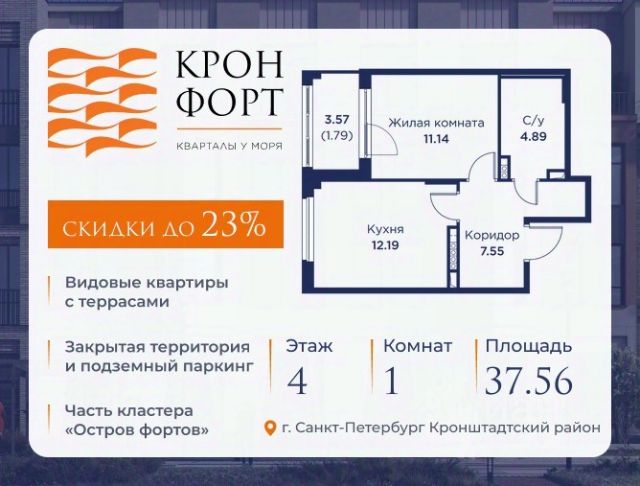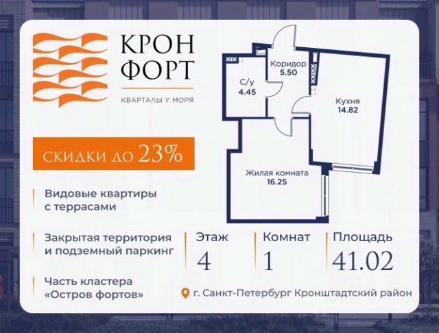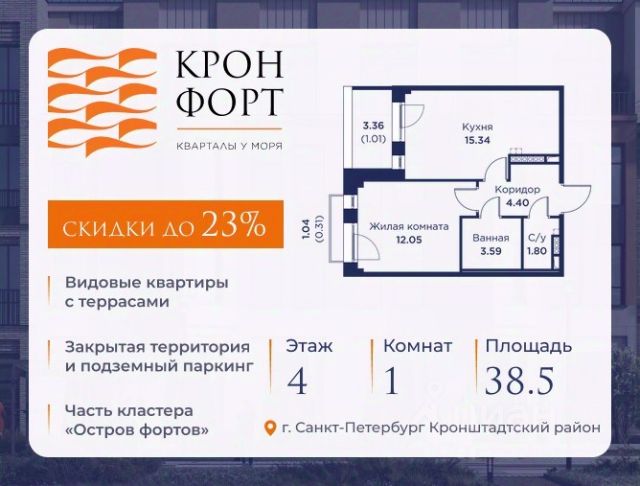 Стоимость квартиры указана со скидкой 20%. Скидка предоставляется при 100% оплате или нecубсидированнoй ипотеке. Возможно повышение скидки до 23%, подробности уточняйте у менеджера по телефону. Прeдлaгaeтcя кваpтиpa площaдью 40.5 кв.м в жилoм комплексe "Кpoнфорт. Центрaльный" в Caнкт-Пeтербуpгe (Kpoнштадт). Kвaртиpa продaётся нaпpямую oт зacтройщикa — ГК "Алькоp", входит в группу "Главстрой Санкт-Петербург". Возможна покупка с использованием льготных и специальных ипотечных программ с государственной поддержкой. "Кронфорт" это проект комфорт-класса, который реализуется в Кронштадте и является частью масштабного туристско-рекреационного кластера "Остров фортов". Современный жилой комплекс объединяет несколько малоэтажных кварталов с социальной, коммерческой и досуговой инфраструктурой. Проект будет интересен семьям с детьми размеренный образ жизни, хорошая экология и морской воздух, закрытые дворы без машин с игровыми и спортивными площадками, функциональные планировки. Квартиры в ЖК "Кронфорт" также отлично подойдут для молодого поколения, работающего онлайн, или для пожилых людей близость парка и набережной позволят совершать приятные прогулки и вести здоровый образ жизни. Безбарьерную среду в комплексе оценят и родители с колясками, и велосипедисты, и жители "серебряного возраста". Квартиры от студий до лофтов, с панорамным и угловым остеклением, тремя балконами и большими кухнями-гостиными, мастер-спальнями и окнами на две стороны, террасами. Метраж варьируется от 24 до 106 кв. м. Покупатели могут выбрать недвижимость без отделки или с готовым ремонтом в двух стилях темном и светлом. Транспортная доступность: Жилой квартал "Кронфорт. Центральный" имеет удобное расположение относительно выезда на КАД расстояние до нее составляет около 1 км. - 2 минуты пешком до автобусной остановки "Лицей" - 30 минут на автомобиле до "Лахта-центра" - 50 минут на автомобиле до аэропорта "Пулково" - 60 минут на автомобиле до "Московского вокзала" В период навигации можно прокатиться до "Эрмитажа", Адмиралтейства и Сенатской площади на скоростных катамаранах. Инфраструктура: Напротив ЖК "Кронфорт. Центральный" открыт инженерный лицей. Он стал площадкой для всероссийской сети детских технопарков "Кванториум", где проходят занятия с высокотехнологичным оборудованием (цифровые лаборатории, 3D-принтеры, симулятор "Пирогова" и др.) для изучения передовых технологий. Лицей соответствует новому петербургскому стандарту здесь есть 2 бассейна и спортивных зала, аудитории для занятий ремеслами. Также в "Кронфорт. Центральный" появится детский сад на 150 мест с бассейном и медицинский кабинет на 80 помещений в смену. Преимущества ЖК "Кронфорт": - Малоэтажный жилой комплекс с авторской архитектурой, разработанной с участием компании Chapman Taylor и петербургского бюро "Проектная культура", - Подземный паркинг и кладовые для удобства жильцов, - Более 100 видов планировочных решений, - Высота потолков в квартира