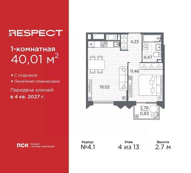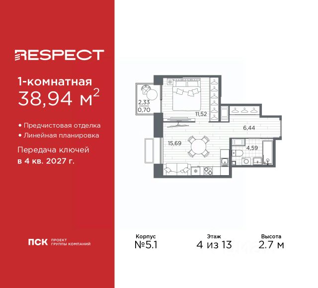Просторная 1-комн. квартира с предчистовой отделкой в ЖК "RESPECT" на 4 этаже. Общая площадь: 41.15 кв.м., жилая: 13.19 кв.м., площадь просторной кухни-столовой: 14.49 кв.м. Все окна выходят на одну сторону. В квартире одна лоджия, один совмещенный санузел. Высота потолков 2.7 м. Дом монолитный, многоподъездный, переменной этажности, от 10 до 13 этажей. Квартира находится в 1-й секции высотой 13 этажей в корпусе 3.2. На этаже 5 квартир. В подъезде 1 пассажирский и 1 грузовой лифт. Начало строительства - 3 квартал 2025 года. Окончание строительства - 4 квартал 2027 года. Оформление сделки по договору долевого участия. В шаговой доступности от жилого комплекса расположены станции метро (расстояние по прямой): "Лесная" (800 м), "Площадь Мужества" (1.4 км), "Выборгская" (1.9 км), также недалеко от этого корпуса расположены станции метро: "Академическая", "Политехническая". Квартал строится на Полюстровском пр, 87, в одной из самых востребованных локаций Петербурга. В 10 минутах пешком - метро "Лесная" и в 10 минутах на транспорте - Петроградская сторона. Высота домов от 7 до 13 этажей. На территории Respect строится школа на 1125 учащихся и детский сад на 240 мест. Запроектированы собственная газовая котельная, закрытая территория, дворы без машин и подземные паркинги с лифтами. Вентилируемые фасады облицованы клинкерным кирпичом. Дома из этого материала служат веками, являясь гордостью хозяев. Дизайн парадных зон и входных групп - сочетание лаконичности отделки и декоративных элементов с текстурами из натурального камня и дерева с приглушенной подсветкой теплым светом. Во входных группах расположены гостевые зоны с мягкой мебелью. Вся территория квартала будет связана единой концепцией благоустройства, разработанной ландшафтным бюро L.BURO. В основе - идея создания увлекательного ландшафтного пространства для насыщенной жизни, включающего в себя пейзажные зоны, современные архитектурные композиции, открытые террасы на стилобатах с зонами отдыха и парклетами, спортивными площадками. Это пространство для людей всех возрастов и различных увлечений. На эксплуатируемой кровле на уровне первого этажа в домах 1 и 4 будут обустроены общественные видовые террасы. В квартале запроектированы внутренние закрытые территории дворов домов без доступа автомобилей и безбарьерная среда для велосипедистов и колясок. Предусмотрены IP-домофония с функцией дистанционного открывания калиток и парадных, а также дистанционный сбор показаний счетчиков и мобильное приложение для жителей. Для безопасности жителей квартала - круглосуточное видеонаблюдение и служба охраны. В каждой квартире предусмотрены внешние корзины для кондиционеров. #Zmb54m