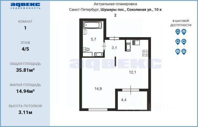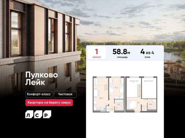 Цена действует при 100% оплате и на определенные ипотечные программы. Подробности — в отделе продаж по телефону. Продается 1-комнатная квартира в ЖК "Пулково Лейк" на 4 этаже. Общая площадь составляет 49.80 кв. м. Квартира с чистовой отделкой. Жилой комплекс "Пулково Лейк" располагается по адресу Санкт-Петербург, Московский. Пулково Лейк - проект малоэтажной застройки на берегу озера на границе Московского и Пушкинского районов. Дома высотой всего 4 этажа, квартиры от уютных студий до трехкомнатных квартир для большой семьи. Широчайший выбор планировок, включая квартиры с мастер-спальнями, патио, каминами, саунами, двухуровневые квартиры. Школа, детские сады, парк на берегу озера и выезды на Пулковское и Петербургское шоссе. Расположение: • 5 мин на авто до Аэропорта Пулково; • 10 мин на авто до станций метро "Московская; • 10-15 мин на авто до городов Пушкина, Павловска и Гатчины; • 20 мин на авто до центра Санкт-Петербурга. Квартиры в проекте сдаются с предчистовой и чистовой отделкой Соmfоrt Stоnе и Соmfоrt Wооd по современным стандартам - Вы можете сами выбрать отделку, подходящую именно Вам. Дома оборудованы самыми современными инженерными системами и "Умным домом". В рамках проекта будет построена современная школа на 925 мест и 2 детских сада на 160 и 240 мест, выезды на Пулковское и Петербургское шоссе, а также храм рядом со сквером "Пулковский рубеж". Общественное пространство вдоль берега озера превратится во всесезонный парк, в котором найдется место для любых активностей от пробежек, катания на САПах и велосипедах до отдыха в шезлонгах и любования закатом солнца. Зимой будет работать каток, проложен лыжный маршрут, предусмотрено место для новогодней елки и горок для детей. Для Ваших питомцев - площадка для выгула собак. Преимущества: • Высота потолков от 2,6 до 4,5 м; • Уникальные планировки; • Парк на берегу озера; • Система "Умный дом"; • Дворы без машин; • Колясочная в парадной; • Видеонаблюдение в холлах, на первом этаже, в лифтах и в паркингах. Успейте приобрести квартиру на выгодных условиях! Чтобы узнать подробности, обращайтесь за консультацией по телефону.