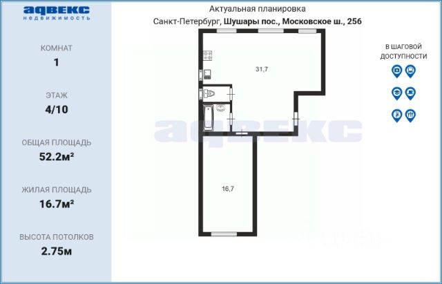 Цена действует при 100% оплате и на определенные ипотечные программы. Подробности — в отделе продаж по телефону. Продается 1-комнатная квартира в ЖК "Пулково Лейк" на 4 этаже. Общая площадь составляет 49.80 кв. м. Квартира с чистовой отделкой. Жилой комплекс "Пулково Лейк" располагается по адресу Санкт-Петербург, Московский. Пулково Лейк - проект малоэтажной застройки на берегу озера на границе Московского и Пушкинского районов. Дома высотой всего 4 этажа, квартиры от уютных студий до трехкомнатных квартир для большой семьи. Широчайший выбор планировок, включая квартиры с мастер-спальнями, патио, каминами, саунами, двухуровневые квартиры. Школа, детские сады, парк на берегу озера и выезды на Пулковское и Петербургское шоссе. Расположение: • 5 мин на авто до Аэропорта Пулково; • 10 мин на авто до станций метро "Московская; • 10-15 мин на авто до городов Пушкина, Павловска и Гатчины; • 20 мин на авто до центра Санкт-Петербурга. Квартиры в проекте сдаются с предчистовой и чистовой отделкой Соmfоrt Stоnе и Соmfоrt Wооd по современным стандартам - Вы можете сами выбрать отделку, подходящую именно Вам. Дома оборудованы самыми современными инженерными системами и "Умным домом". В рамках проекта будет построена современная школа на 925 мест и 2 детских сада на 160 и 240 мест, выезды на Пулковское и Петербургское шоссе, а также храм рядом со сквером "Пулковский рубеж". Общественное пространство вдоль берега озера превратится во всесезонный парк, в котором найдется место для любых активностей от пробежек, катания на САПах и велосипедах до отдыха в шезлонгах и любования закатом солнца. Зимой будет работать каток, проложен лыжный маршрут, предусмотрено место для новогодней елки и горок для детей. Для Ваших питомцев - площадка для выгула собак. Преимущества: • Высота потолков от 2,6 до 4,5 м; • Уникальные планировки; • Парк на берегу озера; • Система "Умный дом"; • Дворы без машин; • Колясочная в парадной; • Видеонаблюдение в холлах, на первом этаже, в лифтах и в паркингах. Успейте приобрести квартиру на выгодных условиях! Чтобы узнать подробности, обращайтесь за консультацией по телефону.