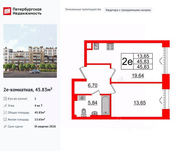 Однокомнатная квартира с предчистовой отделкой в ЖК "Северный ветер" на 4 этаже. Общая площадь: 69.81 кв.м., жилая: 16.3 кв.м., площадь просторной кухни-столовой: 30.2 кв.м. Все окна выходят на одну сторону. В квартире одна лоджия, один совмещенный и один раздельный санузел. Высота потолков 3.1 м.