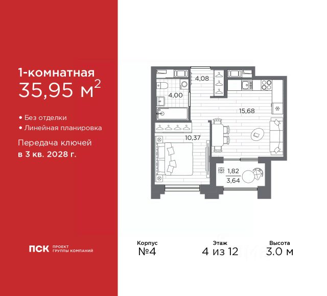 Однокомнатная квартира от застройщика в Клубный квартал "Ассамблея" на 4 этаже. Квартира без отделки, после оформления собственности можно делать ремонт. Общая площадь: 38.82 кв.м., жилая: 10.17 кв.м., площадь просторной кухни-столовой: 17.13 кв.м. Все окна выходят на одну сторону. В квартире одна лоджия, один совмещенный санузел. Высота потолков 3.0 м.