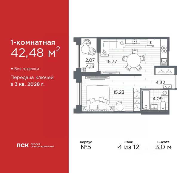 Дом монолитный, черырехподъездный, высотой 12 этажей. Квартира находится в 4-й секции в корпусе 5. На этаже 10 квартир. В подъезде 1 пассажирский и 1 грузовой лифт. Окончание строительства - 3 квартал 2028 года. Оформление сделки по договору долевого участия.