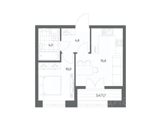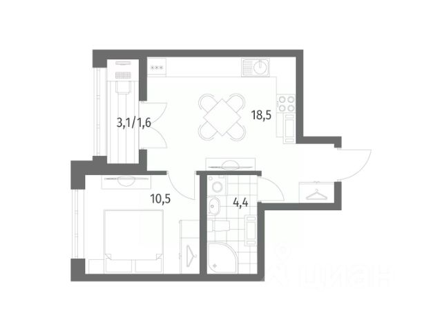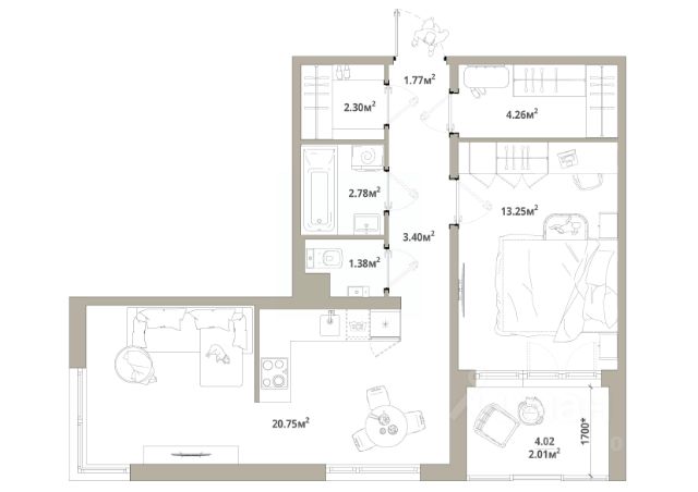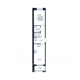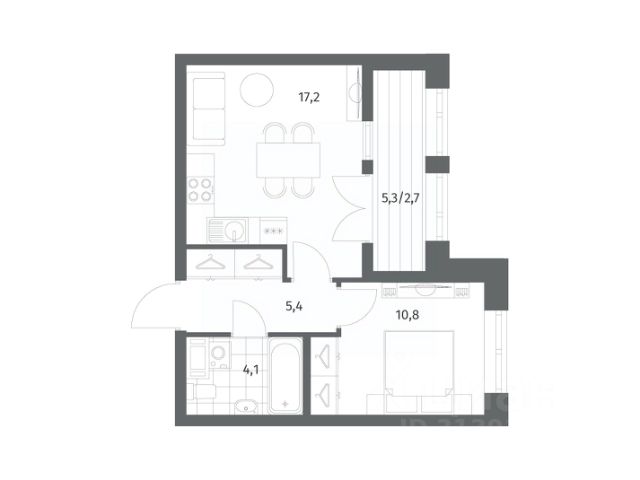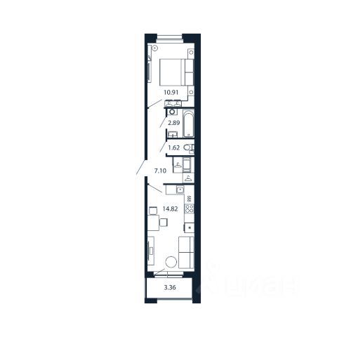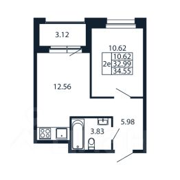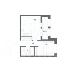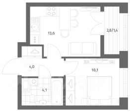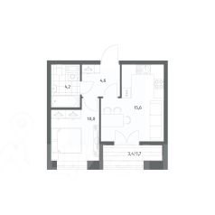 1-комн. квартира с предчистовой отделкой в ЖК "Брусника в Новоселье" на 5 этаже. Общая площадь: 44.34 кв.м., жилая: 13.8 кв.м., площадь просторной кухни-столовой: 18.5 кв.м. Все окна выходят на одну сторону. В квартире одна лоджия, один совмещенный санузел. Высота потолков 2.7 м.