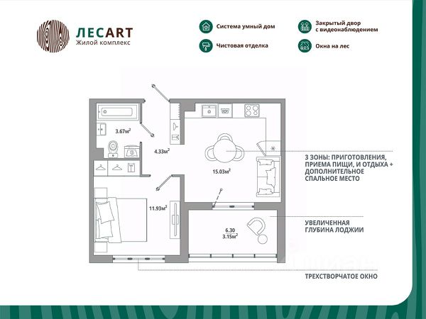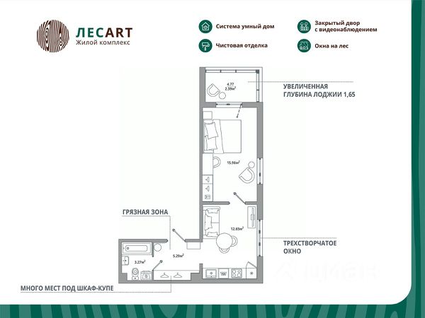 Продаётся 1-комнатная квартира 114, общей площадью 38.11 кв.м., на 5. Дом комфорт-класса, 12 этажей, в окружении леса и малоэтажной застройки. Проект с умным домом. Передача квартир в апреле 2026г. РАСПОЛОЖЕНИЕ И БЛАГОУСТРОЙСТВО Расположение ЖК "ЛесART" порадует любителей чистого воздуха — рядом находятся лесопитомник и Шунгеровский заказник. Особенность комплекса это его ART дворы, которые оформлены по мотивам произведений Василия Кандинского, Пита Мондриана и Пабло Пикассо. Дворы закрыты от машин, что обеспечивает безопасность детей и взрослых. Для семей с детьми особенно удобно наличие детского сада и школы прямо во дворе комплекса. На первом этаже расположены магазины, маркетплейсы, кофейни и всё что необходимо для повседневной жизни. Холлы - это продуманные пространства с колясочными, сквозными проходами и приятной музыкой в лифтах. СИСТЕМА УМНОГО ДОМА В КАЖДОЙ КВАРТИРЕ - Комфорт. Управление освещением, мультимедиа и климат-контролем. - Безопасность. Видеонаблюдение и мониторинг систем безопасности. - Экономия. Контроль систем и оптимизация энергопотребления. - Удобство. Управление с помощью мобильного телефона. ГК "ЕДИНО" Входит в тройку компаний-лидеров региона по потребительским качествам жилых комплексов, объемам ввода жилья и объемам текущего строительства. В цифрах: - 23 года на рынке - Более 50 построенных домов - 60 000+ счастливых обладателей квартир ПРЕИМУЩЕСТВА ПОКУПКИ В ЖК "ЛЕСART": - Сниженная ставка по семейной ипотеке от 5,5%; - Рассрочка без переплаты; - Обмен старой квартиры на новую без комиссии; - Возможность использовать материнский капитал; ЗАПИСЫВАЙТЕ НА ПРОСМОТР! Мы ждем Вас в нашем уютном шоуруме. Вы увидите отделку, дизайнерские решения и познакомитесь со сценариями Умного дома! Такси до офиса продаж и обратно БЕСПЛАТНО!