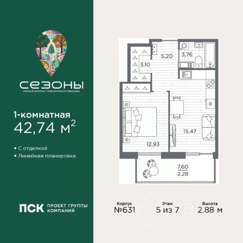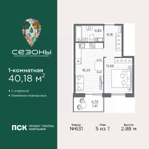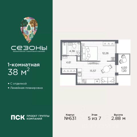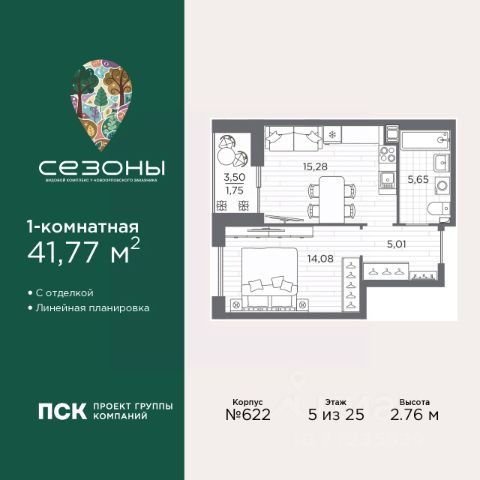 1-комн. квартира с отделкой в ЖК "Сезоны" на 5 этаже. Общая площадь: 41.77 кв.м., жилая: 14.08 кв.м., площадь просторной кухни-столовой: 15.28 кв.м. Все окна выходят на одну сторону. В квартире одна лоджия, один совмещенный санузел. Высота потолков 2.76 м. Квартира находится в корпусе 622. Дом монолитный, одноподъездный, высотой 25 этажей. На этаже 10 квартир. В подъезде 2 пассажирских и 1 грузовой лифт. Начало строительства - 4 квартал 2025 года. Окончание строительства - 2 квартал 2028 года. Оформление сделки по договору долевого участия. Видовой жилой комплекс "Сезоны" от ГК ПСК возводится в одном из самых востребованных и престижных районов Санкт-Петербурга - Приморском, рядом с Суздальским и Выборгским шоссе. Такое расположение обеспечивает удобный выезд в разные части города, сочетая городской комфорт с близостью к природе. Всего в 50 метрах находится природный заказник "Новоорловский" и речка Каменка, а в пешей доступности - Суздальские озёра. Приморский район отличается развитой социальной и транспортной инфраструктурой. Здесь расположены крупные торговые и деловые центры, современные спортивные объекты, медицинские учреждения, магазины, кафе и рестораны. Комплекс включает четыре корпуса, ввод которых в эксплуатацию запланирован на 2028 год. Проект и прилегающий микрорайон разработаны в соответствии с концепцией "15-минутного города", при которой вся необходимая инфраструктура находится в шаговой доступности. В ближайшем окружении - две школы, пять детских садов, магазины, кафе, салоны красоты, банковские отделения и пункты выдачи заказов. Также предусмотрены два четырёхъярусных паркинга с лифтами на 288 машиномест. О застройщике ГК ПСК - один из крупнейших девелоперов Санкт-Петербурга с более чем 18-летней историей. Компания реализует проекты во всех сегментах недвижимости - от премиальных жилых комплексов до масштабных кварталов комфорт-класса и апарт-отелей. По данным портала ЕРЗ.РФ, ПСК входит в ТОП-3 крупнейших застройщиков Санкт-Петербурга по объёму текущего строительства. Портфель компании превышает 3 млн кв. м жилой и коммерческой недвижимости. Все объекты сдаются строго в срок и отличаются высоким уровнем архитектурных и инженерных решений. #2T0lId