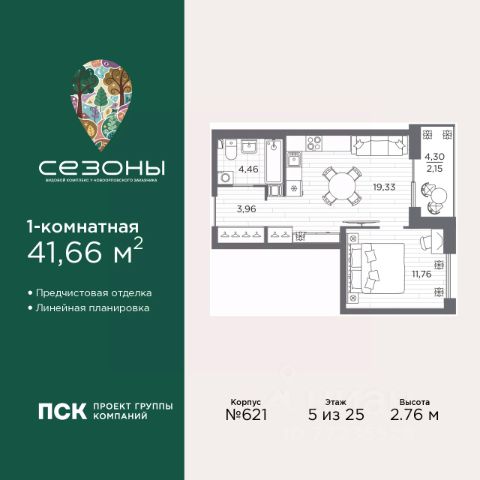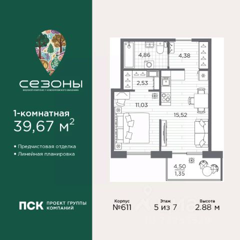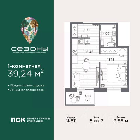 1-комн. квартира с отделкой в ЖК "Сезоны" на 5 этаже. Общая площадь: 42.74 кв.м., жилая: 12.93 кв.м., площадь просторной кухни-столовой: 15.47 кв.м. Все окна выходят на одну сторону. В квартире один балкон, один совмещенный санузел. Терраса представляет собой роскошную зону отдыха, где вы на свой вкус можете создать атмосферу комфорта и уюта. Высота потолков 2.88 м. Дом монолитный, многоподъездный, высотой 7 этажей. Квартира находится в 1-й секции в корпусе 631. На этаже 5 квартир. В подъезде 1 грузовой лифт. Начало строительства - 4 квартал 2025 года. Окончание строительства - 2 квартал 2028 года. Оформление сделки по договору долевого участия. Видовой жилой комплекс "Сезоны" от ГК ПСК возводится в одном из самых востребованных и престижных районов Санкт-Петербурга - Приморском, рядом с Суздальским и Выборгским шоссе. Такое расположение обеспечивает удобный выезд в разные части города, сочетая городской комфорт с близостью к природе. Всего в 50 метрах находится природный заказник "Новоорловский" и речка Каменка, а в пешей доступности - Суздальские озёра. Приморский район отличается развитой социальной и транспортной инфраструктурой. Здесь расположены крупные торговые и деловые центры, современные спортивные объекты, медицинские учреждения, магазины, кафе и рестораны. Комплекс включает четыре корпуса, ввод которых в эксплуатацию запланирован на 2028 год. Проект и прилегающий микрорайон разработаны в соответствии с концепцией "15-минутного города", при которой вся необходимая инфраструктура находится в шаговой доступности. В ближайшем окружении - две школы, пять детских садов, магазины, кафе, салоны красоты, банковские отделения и пункты выдачи заказов. Также предусмотрены два четырёхъярусных паркинга с лифтами на 288 машиномест. О застройщике ГК ПСК - один из крупнейших девелоперов Санкт-Петербурга с более чем 18-летней историей. Компания реализует проекты во всех сегментах недвижимости - от премиальных жилых комплексов до масштабных кварталов комфорт-класса и апарт-отелей. По данным портала ЕРЗ.РФ, ПСК входит в ТОП-3 крупнейших застройщиков Санкт-Петербурга по объёму текущего строительства. Портфель компании превышает 3 млн кв. м жилой и коммерческой недвижимости. Все объекты сдаются строго в срок и отличаются высоким уровнем архитектурных и инженерных решений. #z7oICc