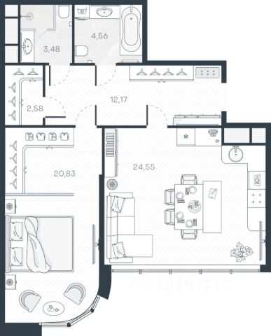 В квартире остается вся мебель включая встроенную технику: стиральную и посудомоечную машины, холодильник, духовой шкаф, микроволновую печь. Выделены спальная зона, просторная гостиная-кухня. На полу итальянская плитка. Пол с подогревом по всей квартире, в том числе и на балконе.