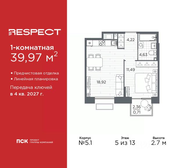 Просторная однокомнатная квартира с предчистовой отделкой в ЖК "RESPECT" на 5 этаже. Общая площадь: 45.84 кв.м., жилая: 12.73 кв.м., площадь просторной кухни-столовой: 18.91 кв.м. Квартира угловая, идеально подойдет любителям тишины и панорамных видов. В квартире одна лоджия, один совмещенный санузел. Высота потолков 2.7 м. Квартира будет сдана с отделкой WHITE BOX, в которую включены следующие виды работ: - заливка стяжки; - установлена система отопления квартиры; - подготовлены потолки; - все стены выровнены, загрунтованы и отштукатурены; - электрическая проводка разведена по комнатам. Квартира будет готова к чистовой отделке. Квартира находится в корпусе 5.1. Дом монолитный, одноподъездный, высотой 13 этажей. На этаже 7 квартир. В подъезде 1 пассажирский и 1 грузовой лифт. Начало строительства - 1 квартал 2026 года. Окончание строительства - 4 квартал 2027 года. Оформление сделки по договору долевого участия. В шаговой доступности от жилого комплекса расположены станции метро (расстояние по прямой): "Лесная" (800 м), "Площадь Мужества" (1.4 км), "Выборгская" (1.9 км), также недалеко от этого корпуса расположены станции метро: "Академическая", "Политехническая". Жилой квартал "RESPECT" строится на Полюстровском пр, 87, в одной из самых востребованных локаций Петербурга. В 10 минутах пешком - метро "Лесная" и в 10 минутах на транспорте - Петроградская сторона. Высота домов от 7 до 13 этажей. Квартиры сдаются с отделкой white box и с чистовой отделкой. На территории Respect строится школа на 1125 учащихся и детский сад на 240 мест. Запроектированы собственная газовая котельная, закрытая территория, дворы без машин и подземные паркинги с лифтами. В проекте предусмотрены трапециевидные балконы или остекленные лоджии, которые, с одной стороны, исключают монотонность фасада, являясь декоративными элементами, с другой дополнительным функциональным пространством в квартирах. Цветовая гармония фасадов каждого дома раскрывает характер квартала. Коричневый цвет клинкерного кирпича со структурой водяных штрихов — цвет уюта и безопасности, сдержанности и надёжности. Вентилируемые фасады облицованы клинкерным кирпичом. Его высокая прочность позволяет давать 100 лет гарантии на этот материал. Водопоглощение клинкерного кирпича составляет менее 5%, за счет чего у него высокая теплопроводность и прочность. В квартале запроектированы внутренние закрытые территории дворов домов без доступа автомобилей и безбарьерная среда для велосипедистов и колясок. Предусмотрены IP-домофония с функцией дистанционного открывания калиток и парадных, а также дистанционный сбор показаний счетчиков и мобильное приложение для жителей. Для безопасности жителей квартала - круглосуточное видеонаблюдение и служба охраны. В каждой квартире предусмотрены внешние корзины для кондиционеров. Вся территория квартала будет связана единой концепцией благоустройства, разработанной ландшафтным бюро L.BURO. На эксплуатируемой кровле на уровне первого этажа в домах 1 и 4 буду