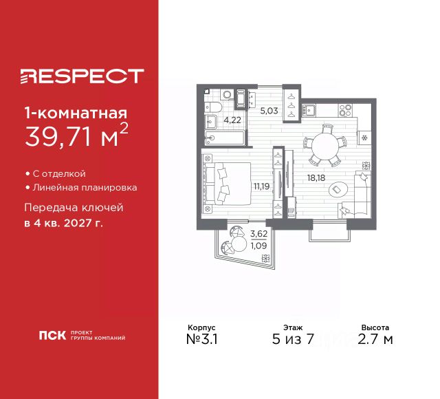Просторная однокомнатная квартира с отделкой в ЖК "RESPECT" на 5 этаже. Общая площадь: 41.32 кв.м., жилая: 12.08 кв.м., площадь просторной кухни-столовой: 18.18 кв.м. Все окна выходят на одну сторону. В квартире один балкон, один совмещенный санузел. Высота потолков 2.7 м. Квартира находится в корпусе 3.1. Дом монолитный, одноподъездный, высотой 7 этажей. На этаже 4 квартиры. В подъезде 1 пассажирский и 1 грузовой лифт. Начало строительства - 3 квартал 2025 года. Окончание строительства - 4 квартал 2027 года. Оформление сделки по договору долевого участия. В шаговой доступности от жилого комплекса имеются станции метро (расстояние по прямой): "Лесная" (800 м), "Площадь Мужества" (1.4 км), "Выборгская" (1.9 км), также недалеко от этого корпуса находятся станции метро: "Академическая", "Политехническая". Квартал строится на Полюстровском пр, 87, в одной из самых востребованных локаций Петербурга. В 10 минутах пешком - метро "Лесная" и в 10 минутах на транспорте - Петроградская сторона. Высота домов от 7 до 13 этажей. На территории Respect строится школа на 1125 учащихся и детский сад на 240 мест. Запроектированы собственная газовая котельная, закрытая территория, дворы без машин и подземные паркинги с лифтами. Вентилируемые фасады облицованы клинкерным кирпичом. Дома из этого материала служат веками, являясь гордостью хозяев. Дизайн парадных зон и входных групп - сочетание лаконичности отделки и декоративных элементов с текстурами из натурального камня и дерева с приглушенной подсветкой теплым светом. Во входных группах расположены гостевые зоны с мягкой мебелью. Вся территория квартала будет связана единой концепцией благоустройства, разработанной ландшафтным бюро L.BURO. В основе - идея создания увлекательного ландшафтного пространства для насыщенной жизни, включающего в себя пейзажные зоны, современные архитектурные композиции, открытые террасы на стилобатах с зонами отдыха и парклетами, спортивными площадками. Это пространство для людей всех возрастов и различных увлечений. На эксплуатируемой кровле на уровне первого этажа в домах 1 и 4 будут обустроены общественные видовые террасы. В квартале запроектированы внутренние закрытые территории дворов домов без доступа автомобилей и безбарьерная среда для велосипедистов и колясок. Предусмотрены IP-домофония с функцией дистанционного открывания калиток и парадных, а также дистанционный сбор показаний счетчиков и мобильное приложение для жителей. Для безопасности жителей квартала - круглосуточное видеонаблюдение и служба охраны. В каждой квартире предусмотрены внешние корзины для кондиционеров. #z6BB1S