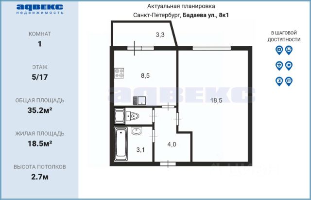 Продается уютная однокомнатная квартира в Санкт-Петербурге по адресу: Союзный проспект, 4. Общая площадь квартиры составляет 34 кв. м, из которых 17 кв. м — жилая площадь, а кухня занимает 8.4 кв. м. Лоджия - 8,4 м2, не включена в общую площадь, отделана, можно использовать, как отдельное жилое пространство. Квартира расположена на 5 этаже 15-этажного монолитно-кирпичного дома. Прекрасный вариант для тех, кто ищет комфортное жилье в развитом районе города. В квартире выполнен современный евроремонт, поэтому вам не придется беспокоиться о дополнительных затратах на обустройство. Просторная лоджия станет отличным местом для отдыха. В квартире есть совмещенный санузел в отличном состоянии. Окна выходят как на улицу, так и во двор, что обеспечивает оптимальное освещение и тишину. Дом оборудован пассажирским и грузовым лифтами, поэтому можно не переживать о доставке тяжелых вещей. На территории дома предусмотрена наземная парковка. Дом в хорошем состоянии, что говорит о надежности и долговечности постройки. В шаговой доступности от дома находятся школы, детские сады и магазины, поэтому вам будет удобно организовать повседневные дела. До станции метро "Проспект Большевиков" можно дойти пешком за 25 минут, что делает местоположение квартиры удобным для тех, кто ценит доступность общественного транспорта. Квартира продается без обременений и готова к быстрой сделке. Возможна покупка в ипотеку. Все документы в порядке, что гарантирует юридическую чистоту сделки. Записывайтесь на просмотр, чтобы оценить все преимущества этой квартиры лично. Мы будем рады ответить на все ваши вопросы и помочь сделать правильный выбор.