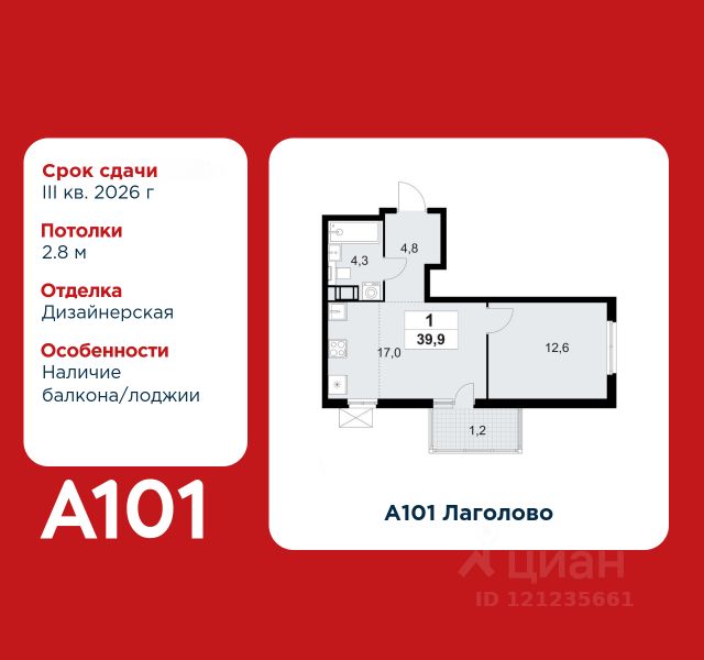 1-комнатная квартира площадью 33.80 в ЖК "А101 Лаголово" c лоджией на 6 этаже. Квартира с отделкой. Вид из окна на улицу. В квартире 1 санузел. Высота потолков 2.95 м. Предложения от застройщика на декабрь 2025: - Гибкая рассрочка 20 000 руб/мес. и первым взносом 10%. ОТДЕЛКА Для квартир с чистовой отделкой предлагается три варианта дизайна: Классика, Карелия светлая и Карелия темная. Варианты всех дизайнерских решений представлены на фотографиях. Подробности можно уточнить у менеджера. На все отделочные работы от застройщика предоставляется гарантия. ОСОБЕННОСТИ ПЛАНИРОВКИ Глубокая лоджия от 1,4м позволяет организовать отдельный кабинет, мастерскую или зимний сад с лаундж-зоной. ПАРАДНАЯ В каждой парадной предусмотрены места для хранения велосипедов и колясок, гостевой санузел, лапамойка (место для мытья домашних животных или колес велосипедов) и удобная зона ожидания для гостей. ДВОРЫ И ОКРУЖЕНИЕ Просторные дворы свободны от машин и закрыты от посторонних. Большую часть комплекса займут благоустроенные зелёные зоны, теневые сады и городские общественные пространства с развитой тротуарной сетью и велодорожками. Каждый дом оборудован системами видеонаблюдения и контроля доступа. "А101 Лаголово" - современный город у подножия знаменитых Дудерговских высот, в объятиях чистейших озёр и зелёных живописных массивов, наполненный всем необходимым для счастливой жизни. ИНФРАСТРУКТУРА. Мы занимаемся комплексным освоением территории. Наш приоритет - доступность всех сервисов для счастливой жизни. 1. Лаголово-город 15-ти минутной доступности. Вся необходимая инфраструктура: магазины, салоны красоты, образовательные учреждения, медицинские центры находятся в 15-ти минутах пешей прогулки от любой точки жилого комплекса. Это позволяет не тратить время на долгие перемещения. 2. Представьте идеальный город, где ребенок может спокойно играть, а пожилой человек наслаждаться заслуженным отдыхом. Жилая среда нашего комплекса может комфортно использоваться как 8-летним ребенком, так и 80-летним пожилым человеком. Дома, улицы, общественные пространства, тротуары спроектированы с заботой о людях разных возрастов. 3. Мы активно развиваем авторскую образовательную экосистему "Лёрнити". Она включает строительство 8 современных детских садов (2000 мест) и 3 школ (2945 учащихся). Мы учим родителей гармонично общаться с детьми, помогаем малышам подготовиться к школе, а подросткам - выбрать будущую профессию и развить таланты. Не хватает средств на покупку кладового помещения? Оформите ипотеку на квартиру и добавьте к ней часть стоимости кладовой. ЗАСТРОЙЩИК ГК "А101" - крупный инвестиционно-строительный холдинг, занимает 6-е место по объему строительства в России (по данным "Единого ресурса застройщиков" на 2023 год). НКР присвоило ГК "А101" кредитный рейтинг A+.ru, подтверждая его надежность и финансовую устойчивость для завершения строительства ЖК.