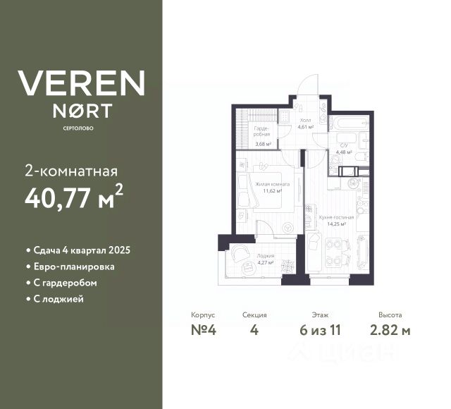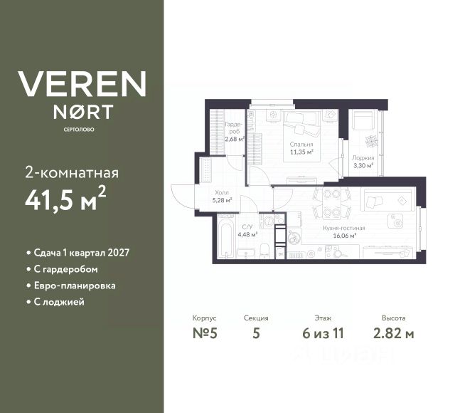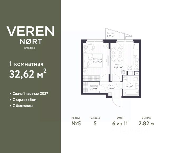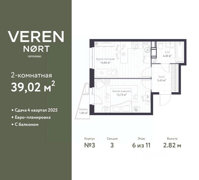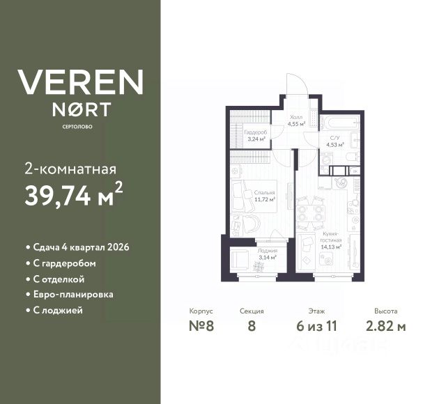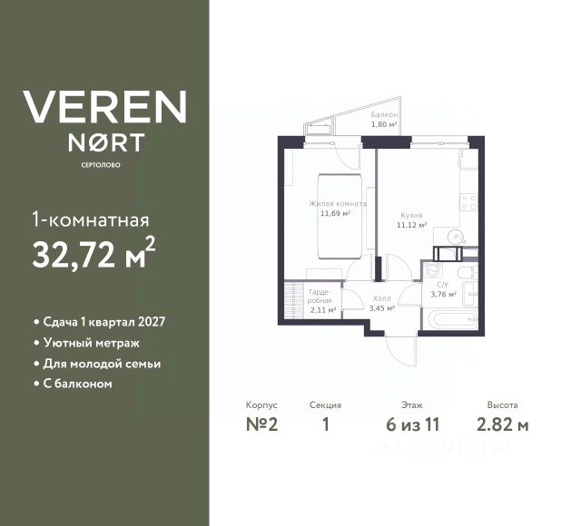 Торопитесь забронировать по этой цене! Период предложения ограничен! Стоимость квартиры указана со скидкой, ваша экономия составит 1,926,290 RUB. Информация по телефону, наши менеджеры вам все расскажут! Просторная 1-комн. квартира в Veren Nort Сертолово на 6 этаже. Квартира без отделки, после оформления собственности можно делать ремонт. Общая площадь: 36.9 кв.м., жилая: 13.94 кв.м., площадь просторной куxни-гостиной: 14.23 кв.м. Квартира угловая, идеально подойдет любителям тишины и панорамных видов. В квартире один балкон, один совмещенный санузел. Высота потолков 2.82 м. Квартира находится в корпусе 1. Дом монолитный, одноподъездный, высотой 11 этажей. На этаже 14 квартир. В подъезде 2 грузовых лифта. Начало строительства - 3 квартал 2023 года. Окончание строительства - 4 квартал 2025 года. Оформление сделки по договору долевого участия. С балконом, евро-планировка, вид на приватный двор. Сочетание современной архитектуры и отличной экологии севера Лен. области. Выразительный облик домов разработан именитым архитектурным бюро "Остоженка". Характеристики жилого комплекса исключительны: продуманный ландшафтный дизайн, оригинальные парадные, разработанные по индивидуальному дизайн-проекту, современные детские и многофункциональные спортивные площадки, летний кинотеатр под открытым небом, два детских сада. Комплекс создается в уже сложившейся инфраструктуре г. Сертолово и обладает удобным транспортным сообщением с Санкт-Петербургом. В 300 метрах от "VEREN NORT сертолово" планируется транспортно-пересадочный узел "Сертолово", который обеспечит удобную железнодорожную связь с Финляндским вокзалом Санкт-Петербурга. #z4ww1d