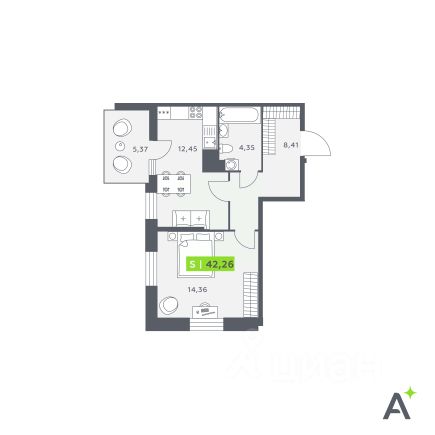 Общая площадь 41.6 м², просторная жилая комната 16.5 м².