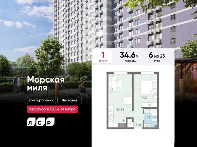 Цена действует при 100% оплате и на определенные ипотечные программы. Подробности — в отделе продаж по телефону. Продается 1-комнатная квартира в ЖК "Морская миля" на 6 этаже. Общая площадь составляет 34.60 кв. м. Квартира с чистовой отделкой. Жилой комплекс "Морская миля" располагается по адресу Санкт-Петербург, Красносельский. Морская миля - жилой комплекс в Красносельском районе Санкт-Петербурга. Расположение комплекса - его главное преимущество: близость к таким историческим памятникам и местам, как Петергоф, Павловский дворец и Царское село позволяет в любой момент насладиться красотами культурной столицы России. Расположение: - всего 350 м до новой станции метро "Юго-Западная"; - 20 минут до Петергофа на автомобиле; - 20 минут до аэропорта "Пулково" на автомобиле; - 30 минут до Царского села на автомобиле. Между корпусами расположены спортивные и детские площадки, пешеходный бульвар. В квартире выполнена полная отделка "Comfort Wood" из качественных материалов: прочный ламинат цвета благородного дуба, фактурные белые обои, керамическая плитка в ванной. Вход в парадные расположен на уровне земли и создает доступную среду для пожилых людей, людей с ограниченными возможностями и мам с колясками. На этажах и в подвале есть кладовые, которые позволят освободить пространство квартиры от лишних вещей. Первые этажи отведены под магазины и колясочные. На территории комплекса находятся наземные паркинги, гостевые парковки, детский сад, школа. В пешей доступности расположены магазины, кафе, аптеки и прочие удобства, необходимые для спокойной и комфортной жизни. Во дворах устроены пешеходные зоны, дворы озеленены и благоустроены: имеются тенистые аллеи, уютные зоны для отдыха детей и взрослых, а также стильные плей-хабы. Преимущества: - Станция метро в пешей доступности - Пешеходный бульвар - Близость к памятникам культуры и архитектуры - Школа и детский сад во дворе - Доступная среда Успейте приобрести квартиру на выгодных условиях! Чтобы узнать подробности, обращайтесь за консультацией по телефону.