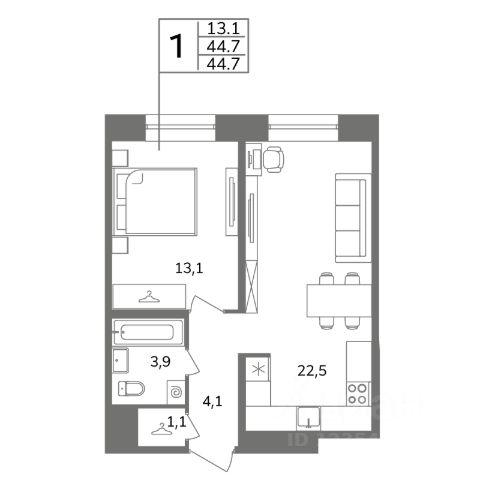 Квартира с удобной планировкой, общая площадь 50,5 кв.м. (вместе с лоджией 5 кв.м.), комната 21,7 кв.м. (при необходимости легко сделать зонирование и получится 2 комнаты, без ущерба для проживания), большая прихожая/коридор 6,82 кв.м., с кладовкой/гардеробной 2,7 кв.м., кухня 8,8 кв.м., с/у раздельный, закрытый тамбур на 4 квартиры.