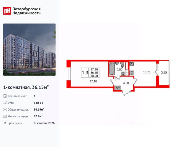 Продается просторная 1-комнатная квартира от застройщика в жилом комплексе "Бионика Заповедная" в динамичном Приморском районе. До метро можно добраться на транспорте всего за 11 минут. Удобная, классическая планировка, кухня 10.8 м², просторная прихожая 4.53 м². Общая площадь квартиры - 36.32 м², жилая 17.13 м², высота потолка 2.77 м. Квартира продается с отделкой "Норд Лайн светлый плюс". Что особенного в ЖК "Бионика Заповедная"? • Оазис в городе 3 минуты пешком до Новоорловского заказника (140 ГА) • Захватывающие виды из окон на хвойный лесопарк • Всесезонный "Заповедный парк" во дворе площадью 23000 кв.м. • 5 единых входных групп с авторским дизайном и лаундж-зонами, сити-виллы на первых этажах с палисадниками и высотой потолков до 4 м • Места притяжения: фонтан "Бионика", спортивный кластер со скейт-парком, фотозоны с арт-объектами