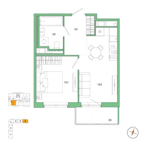 42,9 м2 + 7,4 м2 утепленный балкон.