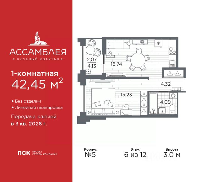 Просторная 1-комн. квартира в Клубный квартал "Ассамблея" на 6 этаже. Квартира без отделки, после выдачи ключей можно делать ремонт. Общая площадь: 42.48 кв.м., жилая: 15.23 кв.м., площадь просторной кухни-столовой: 16.77 кв.м. Все окна выходят на одну сторону. В квартире одна лоджия, один совмещенный санузел. Высота потолков 3.0 м.
