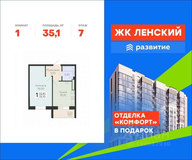 В продаже квартира площадью 35.05 кв. м с отделкой на 7 этаже 16 этажного дома. Квартира находится в 4835 корпусе: Жилой комплекс "Ленский" - место, где встречаются природа и городская среда, а умиротворение загородной жизни сочетается с комфортом. Проект располагается на северо-востоке Санкт-Петербурга, в Южном микрорайоне Всеволожска, в 16 км от КАД, с удобным выездом на Колтужское шоссе и Дорогу Жизни. В его состав входят два 18-этажных корпуса с видами на Колтушские высоты, сервисы повседневной инфраструктуры, собственный приватный двор, просторный паркинг для жителей и гостей. Девелопер проекта - федеральный застройщик ГК "Развитие". Транспортная доступность На автомобиле: • 30 мин до станции метро "ул. Дыбенко" • 35 мин до центра Санкт-Петербурга Архитектура Архитектурный облик отличается современным дизайном. Панорамные окна с большой площадью остекления наполняют квартиры светом, актуальная финская технология Peikko защищает квартиры от промерзания даже в северном климате. Дома прочные, долговечные, их конструкция гарантирует тёплый микроклимат зимой, прохладу летом и отличную звукоизоляцию. Планировочные решения Функциональные планировки отличаются простотой и эргономичностью, пространство эффективно используется даже на небольшой площади. К кухне примыкает просторная лоджия с панорамным остеклением, во всех двух- и трехкомнатных квартирах - по два санузла. Все квартиры сдаются с отделкой white box, которая позволяет существенно сократить стоимость и сроки ремонта. По желанию доступны варианты чистовой отделки под ключ: "комфорт" и "бизнес" с использованием современных материалов. Благоустройство - приватный двор без машин; - всесезонное озеленение; - спортивный корт для футбола и баскетбола; - детские площадки с мягким покрытием; - площадка для настольного тенниса; - скамейки и беседки для отдыха по всему периметру; - прогулочные и велосипедные дорожки в тени деревьев; - сквозные парадные с большими окнами; - просторная входная группа на уровне земли; - колясочные помещения; - торговая галерея в шаговой доступности. Окружение - 5 парков: заповедник "Колтушские высоты", парк "Софиевка", "Румболовский", "Кенша", Державинский и Алексеевский парки. За 5-10 минут можно добраться транспортом до Песчанки и Петропавловского парка. Ковалевский лесопарк выделяется прекрасными экотропами, зонами для пикников и велодорожками, а Ждановские озера - благоустроенными пляжами; - рядом Колтушинский фреш-маркет с фермерскими продуктами и крупный ТЦ "Юбилейный", где работают более 70 магазинов, кинотеатр и фуд-корт; - 10 детских садов, начальная и средняя школы, центры дополнительного образования, творческие секции; - в ближайшей доступности фитнес-центры, бассейн, теннисный клуб и даже центр верховой езды; - культурные и знаковые места: Музей-усадьба "Приютино", музей "Дом Авиаторов", мемориальный комплекс "Дорога Жизни", многочисленные пешеходные маршруты.