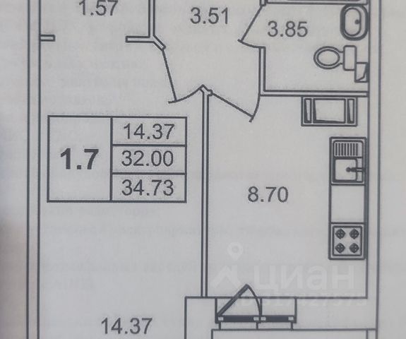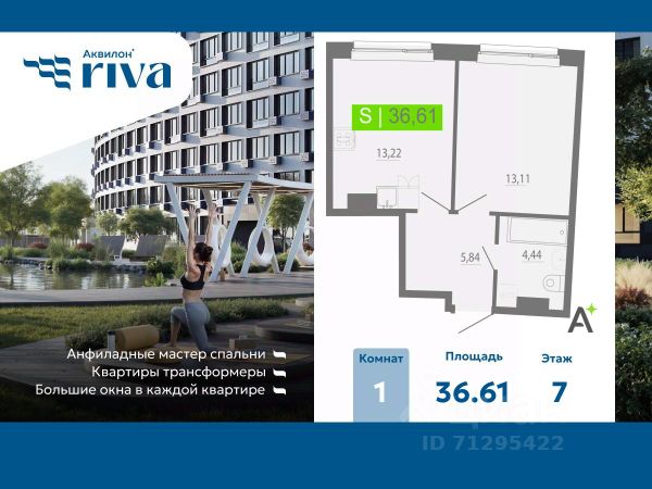 1-комн. квартира от застройщика с отделкой в ЖК "Аквилон RIVA" на 7 этаже. Общая площадь: 36.17 кв.м., площадь просторной кухни-столовой: 13.7 кв.м. Высота потолков 2.73 м.