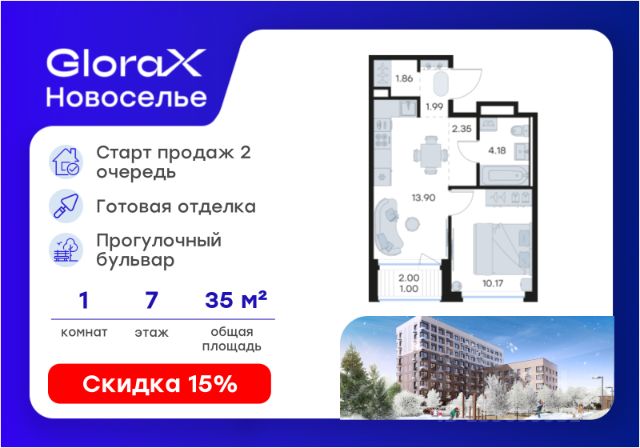 Продаётся 1-комн. квартира площадью 34,5 кв.м на 7 этаже 12 этажного дома (Корпус 4.2, Секция 1) проекта ПИК Таллинский парк. Светлый просторный подъезд на уровне земли, функциональная планировка, большие окна, без отделки. "Таллинский парк" - проект в Ленинградской области, в районе Новоселье. До станции метро "Проспект Ветеранов" - 15 минут на автомобиле, а до КАД можно доехать всего за 4 минуты. "Таллинский парк" включает 16 жилых домов, детский сад и школу. В проекте появится центральный сквер с обильным озеленением, а через весь квартал протянутся широкие пешеходные бульвары. В зелёных дворах-парках будут оборудованы современные детские и спортивные площадки, обустроены места для отдыха. На первых этажах разместятся магазины, кафе и другие сервисы. Проектом предусмотрены персональные кладовые помещения - это доступный, экономичный и удобный способ хранения сезонных и крупногабаритных вещей. Освободите свою квартиру для полноценной жизни. Район Новоселье активно развивается в городском формате: здесь уже работают детские сады, школа и магазины. Для любителей зимних видов спорта открыта круглосуточная ледовая арена Ice Rink. За покупками и развлечениями также можно быстро доехать: 10 минут - и вы в Аутлете Fashion House Таллинское, гипермаркетах Лента, Леруа Мерлен и Окей. В 10 минутах на автомобиле находится Финский залив, на берегу которого расположились объекты культурного наследия. Рядом - Константиновский парк с отреставрированным дворцом, а чуть дальше расположена усадьба Знаменка. В великолепном Петергофе вы будете уже через 20 минут. Артикул 1026361 (Застройщик ООО "СПЕЦИАЛИЗИРОВАННЫЙ ЗА СТРОЙЩИК "СТРОЙ-ЭКСПЕРТ ") [cn_sbp_1807022]