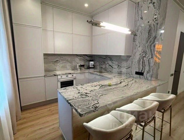 Столешница компакт плита. В столовой зоне стол шпона дуба на 4 персоны с удобными мягкими стульями В зоне гостиной комфортный диван-кровать, тв 55 дюймов
