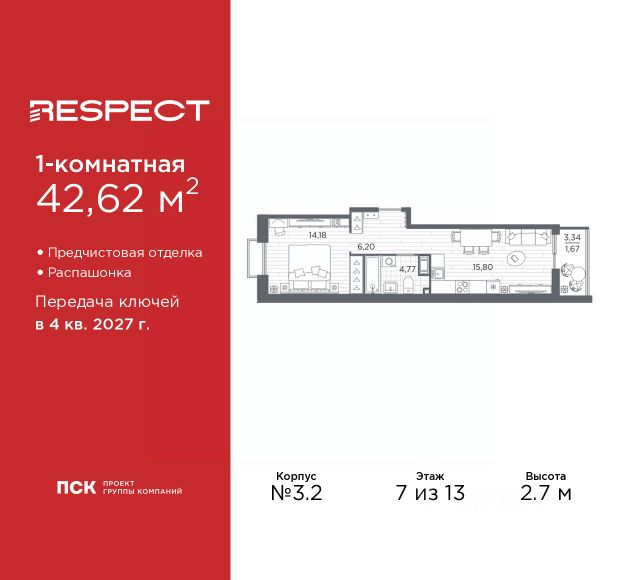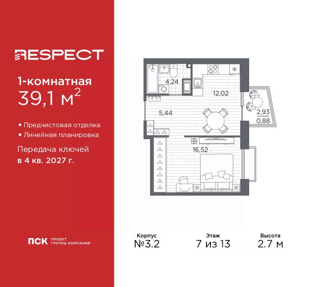 Продается 1-комн. квартира с предчистовой отделкой в ЖК "RESPECT" на 7 этаже. Общая площадь: 40.97 кв.м., жилая: 14.88 кв.м., площадь просторной кухни-столовой: 14.43 кв.м. Угловая квартира, очень светлая, естественная вентиляция при открытии окон. В квартире один балкон, один совмещенный санузел. Высота потолков 2.7 м. Квартира будет сдана с отделкой WHITE BOX, в которую включены следующие виды работ: - заливка стяжки; - установлена система отопления квартиры; - подготовлены потолки; - все стены выровнены, загрунтованы и отштукатурены; - электрическая проводка разведена по комнатам. Квартира будет готова к чистовой отделке. Дом монолитный, многоподъездный, переменной этажности, от 10 до 13 этажей. Квартира находится в 1-й секции высотой 13 этажей в корпусе 3.2. На этаже 5 квартир. В подъезде 1 пассажирский и 1 грузовой лифт. Начало строительства - 3 квартал 2025 года. Окончание строительства - 4 квартал 2027 года. Оформление сделки по договору долевого участия. В шаговой доступности от жилого комплекса имеются станции метро (расстояние по прямой): "Лесная" (800 м), "Площадь Мужества" (1.4 км), "Выборгская" (1.9 км), также недалеко от этого корпуса расположены станции метро: "Академическая", "Политехническая". Квартал строится на Полюстровском пр, 87, в одной из самых востребованных локаций Петербурга. В 10 минутах пешком - метро "Лесная" и в 10 минутах на транспорте - Петроградская сторона. Высота домов от 7 до 13 этажей. На территории Respect строится школа на 1125 учащихся и детский сад на 240 мест. Запроектированы собственная газовая котельная, закрытая территория, дворы без машин и подземные паркинги с лифтами. Вентилируемые фасады облицованы клинкерным кирпичом. Дома из этого материала служат веками, являясь гордостью хозяев. Дизайн парадных зон и входных групп - сочетание лаконичности отделки и декоративных элементов с текстурами из натурального камня и дерева с приглушенной подсветкой теплым светом. Во входных группах расположены гостевые зоны с мягкой мебелью. Вся территория квартала будет связана единой концепцией благоустройства, разработанной ландшафтным бюро L.BURO. В основе - идея создания увлекательного ландшафтного пространства для насыщенной жизни, включающего в себя пейзажные зоны, современные архитектурные композиции, открытые террасы на стилобатах с зонами отдыха и парклетами, спортивными площадками. Это пространство для людей всех возрастов и различных увлечений. На эксплуатируемой кровле на уровне первого этажа в домах 1 и 4 будут обустроены общественные видовые террасы. В квартале запроектированы внутренние закрытые территории дворов домов без доступа автомобилей и безбарьерная среда для велосипедистов и колясок. Предусмотрены IP-домофония с функцией дистанционного открывания калиток и парадных, а также дистанционный сбор показаний счетчиков и мобильное приложение для жителей. Для безопасности жителей квартала - круглосуточное видеонаблюдение и служба охраны. В каждой квартире предусмотрены внешни