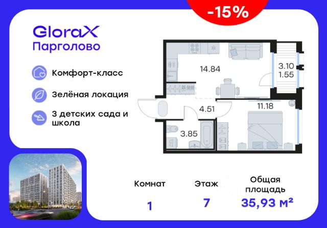 Продается 1-комн. квартира на 7-м этаже в проекте комфорт-класса GloraX Парголово. Общая площадь лота составляет 32,93 кв. м, из которых 10,15 кв. м отведено под жилую и 13,98 кв. м под кухонную зону. Номер квартиры - 64. Преимущества: - Квартира комфорт-класса с полной чистовой отделкой - Зеленый район, Шуваловский парк в 20 мин. пешком - 10 мин. до КАД, 15 мин. до ЗСД - 5 эт. паркинг на 451 м/м - Закрытые дворы с видеонаблюдением - Детские площадки с геопласткой и бизиборадми - Сады и школы в шаговой доступности - Спортивные площадки и велодорожки - Собственный комьюнити-центр - Келлеры для хранения - Коммерческие помещения на 1 этажах GloraX Парголово — масштабный проект комфорт-класса в Выборгском районе Санкт-Петербурга. Место, продуманное до мелочей, где все, что необходимо — рядом. Архитектурно-пространственное решение отличается лаконичностью и строгостью и придает проекту свой характер. Внутренние дворы закрыты от внешнего мира, создавая приватную территорию для жителей. Живите на природе, но с комфортом мегаполиса. Десять минут на велосипеде или полчаса пешком — и вы окажетесь в одном из культовых мест отдыха петербуржцев: Шуваловском парке, Орловском заказнике с их чистыми карьерами или на Суздальских озерах. До ж/д станции "Парголово" 7 минут на автомобиле, до метро Проспект Просвещения 25 минут, КАД 10 минут, ЗСД 15 минут. В шаговой доступности остановка общественного транспорта. В шаговой доступности — собственные школы и детские сады. Здесь все создано для максимального комфорта каждого жителя. Приватное пространство внутреннего двора с беседками с розетками для работы и отдыха, зеленый двор с уютным многоуровневым освещением, детскими эко-площадками и спортивными workout создает неповторимую атмосферу, заряжающую энергией на новые свершения. Квартиры сдаются с предчистовой отделкой White box, с возможностью дозаказа отделки в двух цветовых вариантах. Цена указана при 100% оплате или стандартной ипотеке. Узнайте подробности в Отделе продаж.